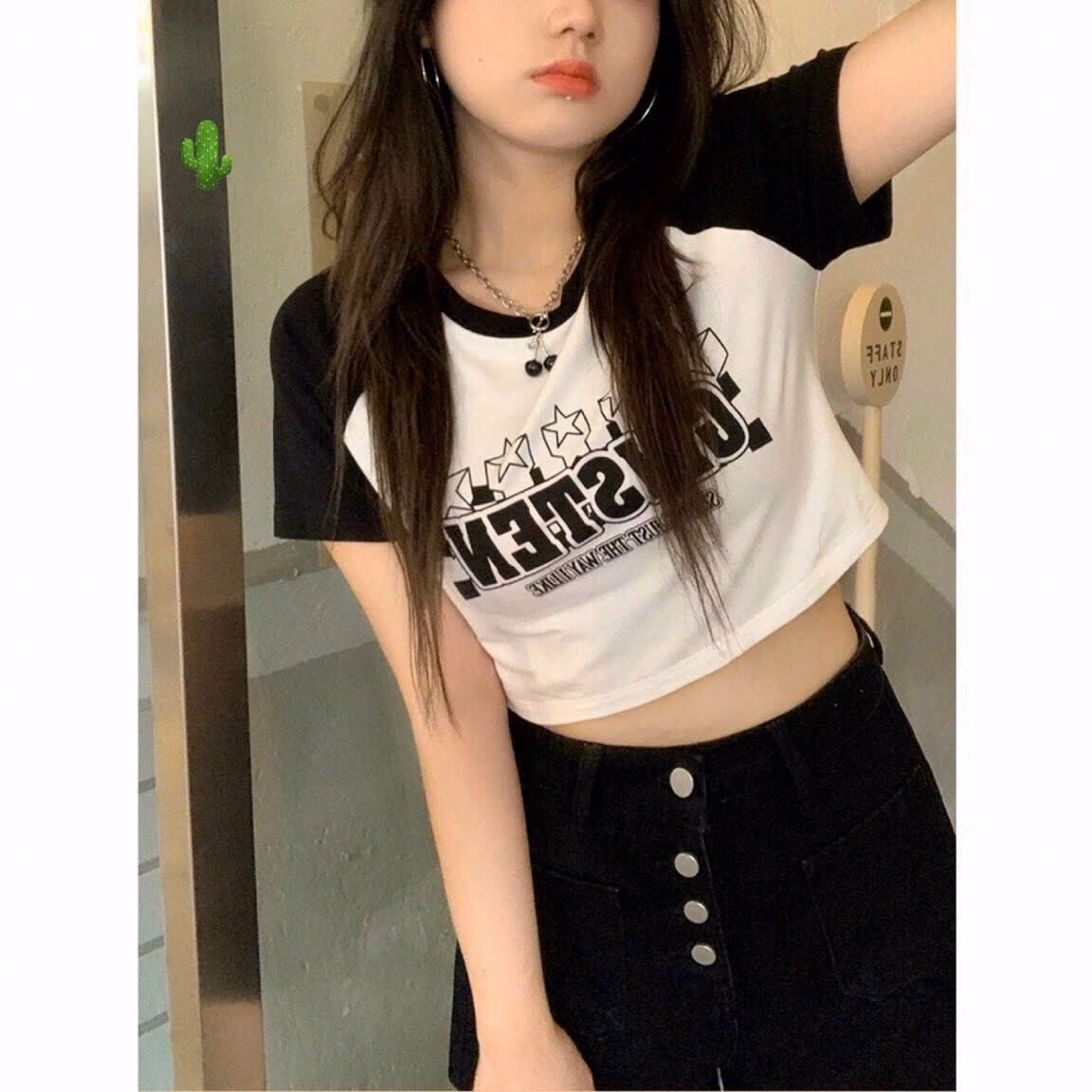 🌸 Áo croptop ôm body nữ cổ tròn in chữ cực cool cực chất