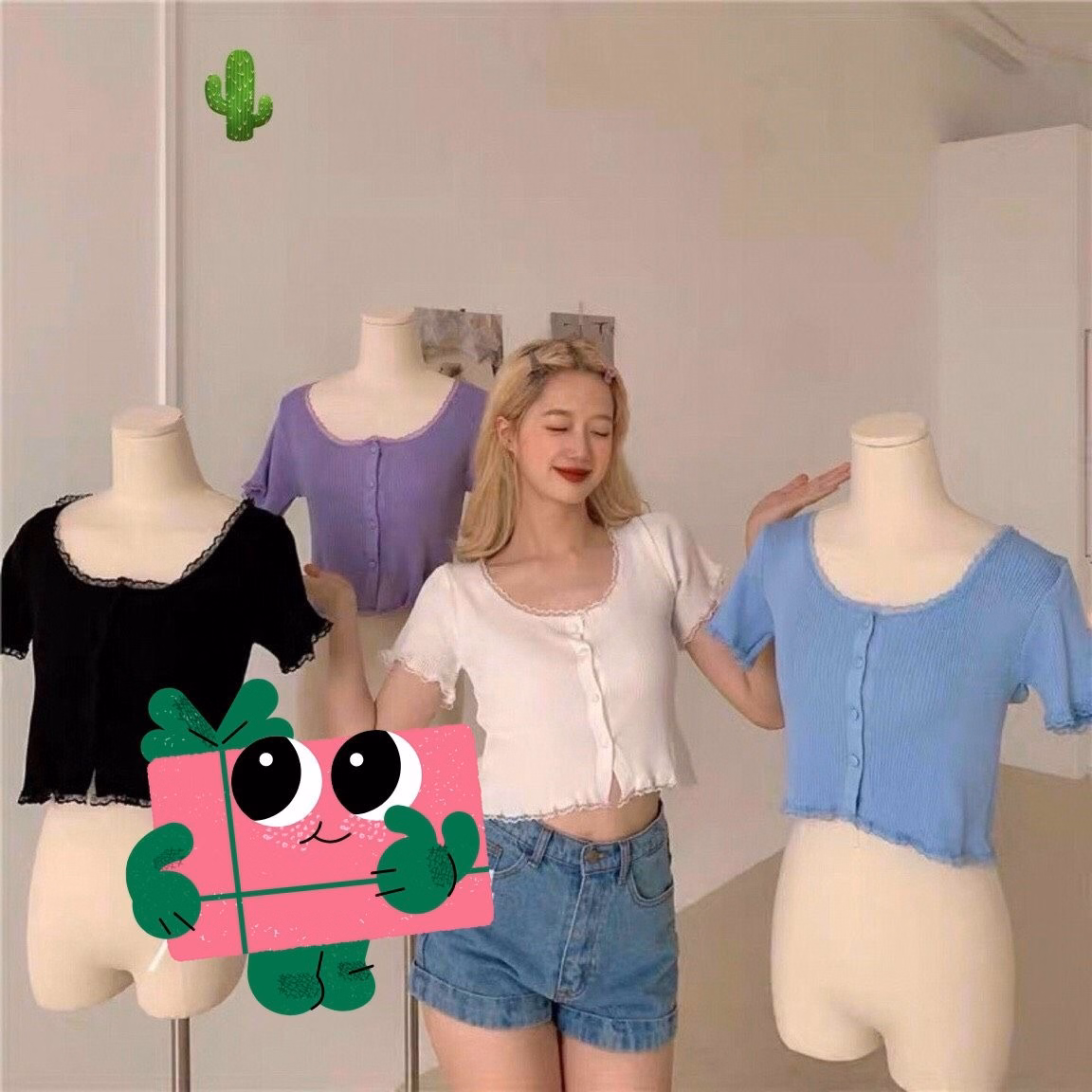Áo Thun Nữ Croptop Phối Viền Ren Đính Nút Tay Lỡ – Ausa House