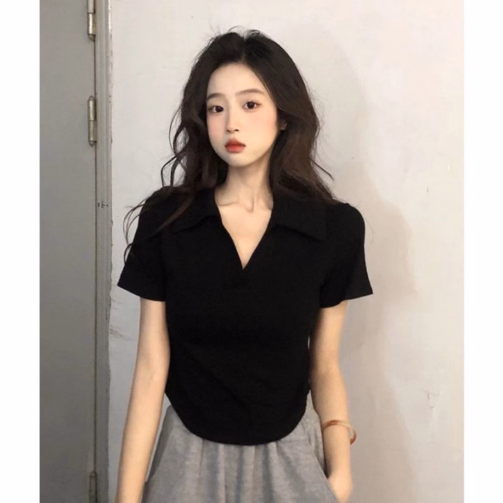 Áo Thun Polo Cọc Tay Dáng Ngắn Chất Tăm Lạnh, Vạt Bầu Ngắn Tay Áo Kiểu Thiết Kế Trơn Bassic