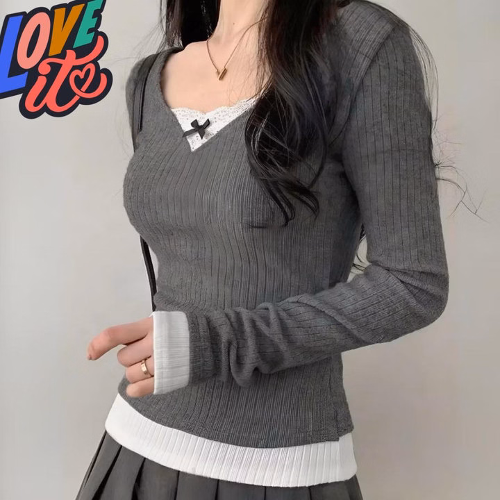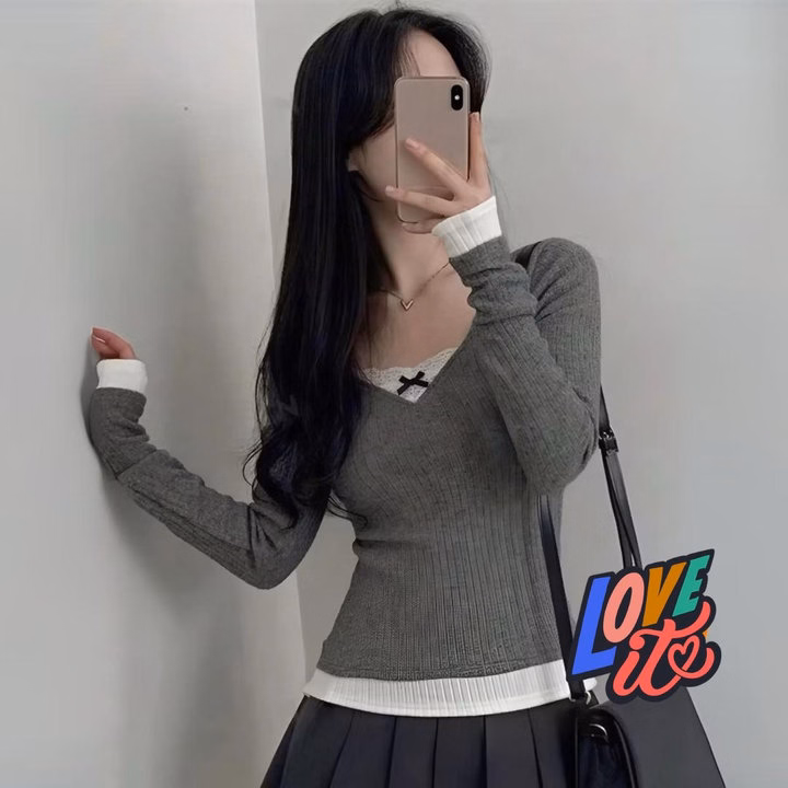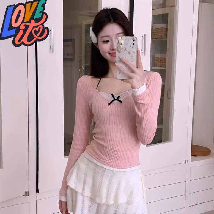 Áo Thun Tay Dài Cổ Tim Phối Ren Đính Nơ Ôm Body Gu40U- Sam Store