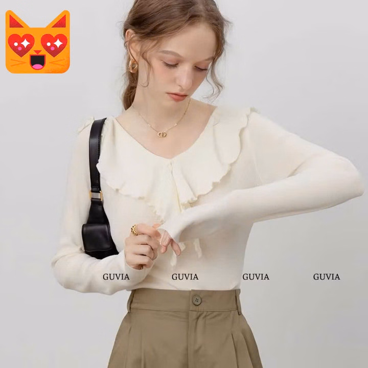 Áo Thun Tay Dài Cổ V Phối Bèo Cuốn Biên Ôm Body Ug47kh- Sam Freesize 38-52kg