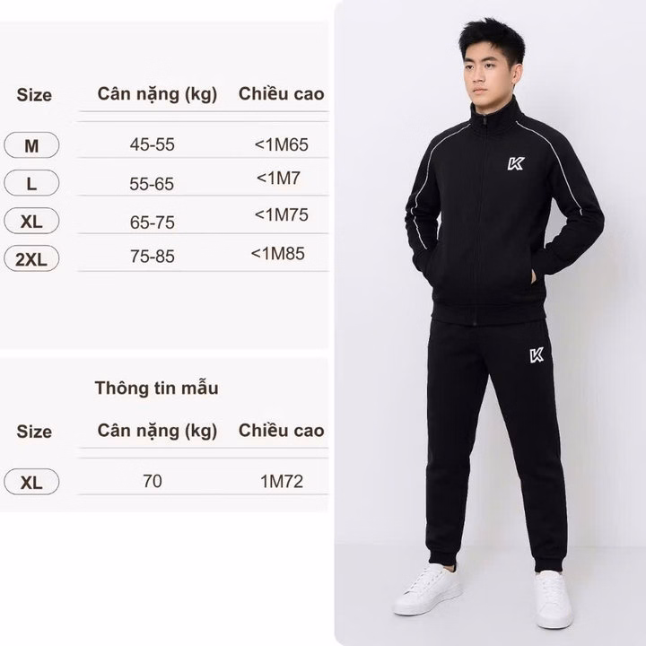 Áo Khoác Kéo Khóa & Quần Jogger Dáng Suông Rộng: Cấu trúc form chuẩn, ôm vừa vặn (Form Slim Fit) nhưng vẫn tạo sự cử động thoải mái tối đa cho mọi hoạt động.