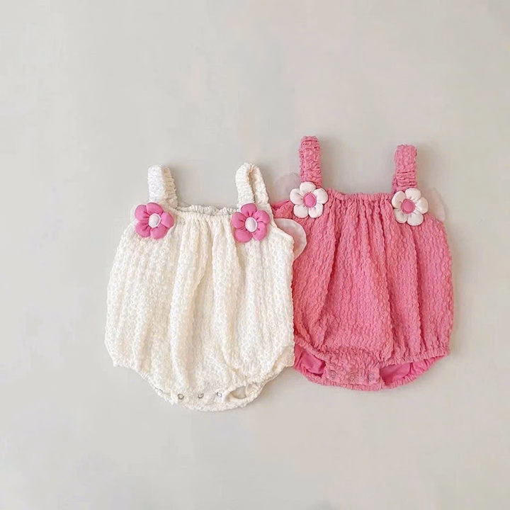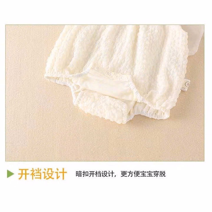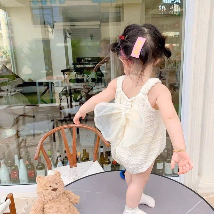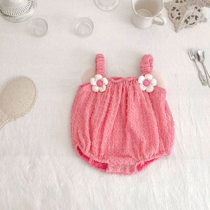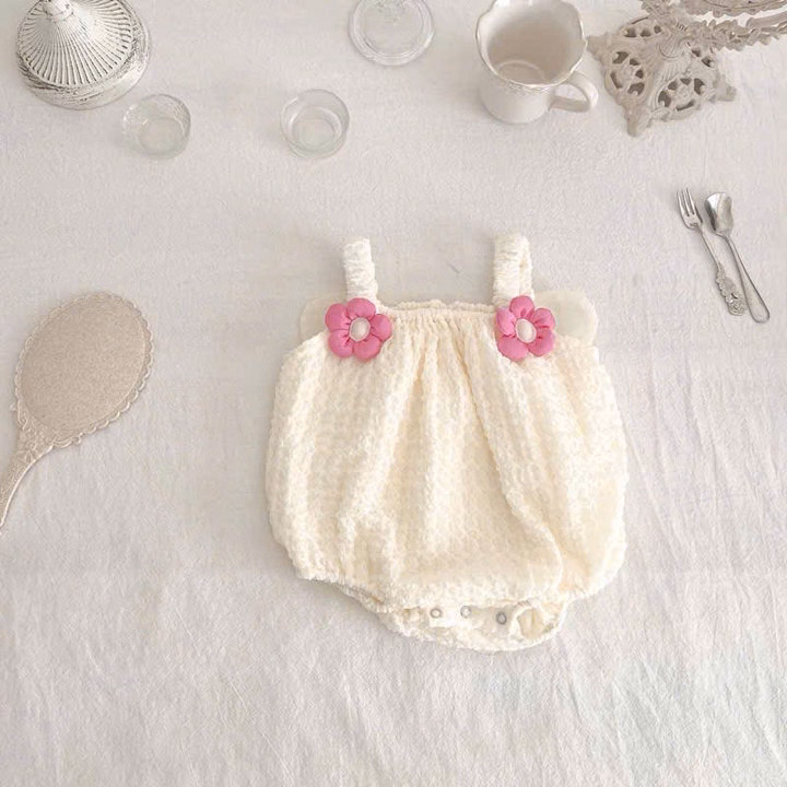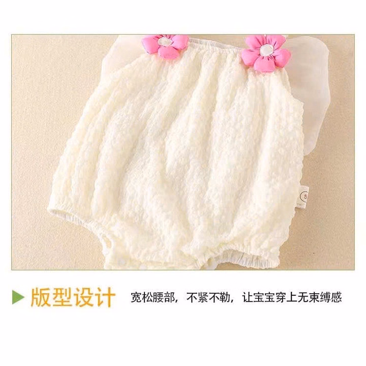 – Thiết kế : Kiểu dáng body suit 2 dây nhún bèo xinh xắn, điểm nhấn là hai bông hoa, cánh siêu xinh, vải nổi gắn trên quai áo và cánh bướm sau lưng tạo vẻ đáng yêu. Phần ống body phồng nhẹ, có nút bấm phía dưới giúp thay tã dễ dàng