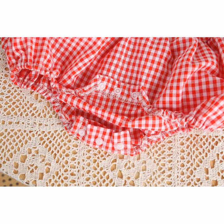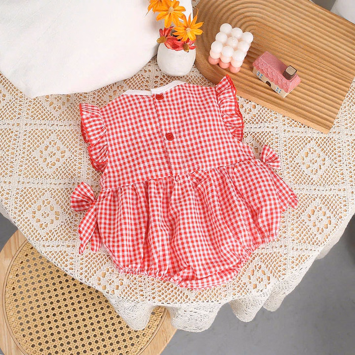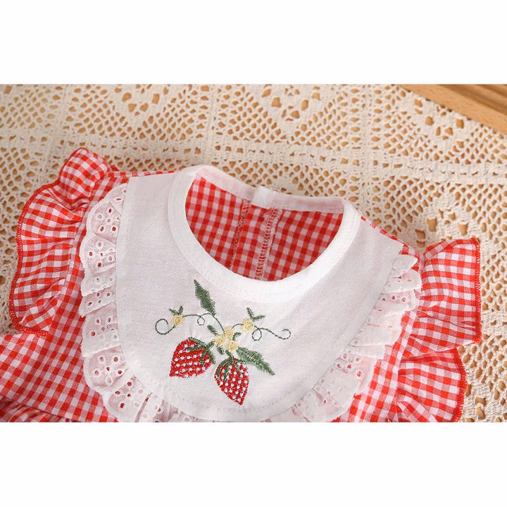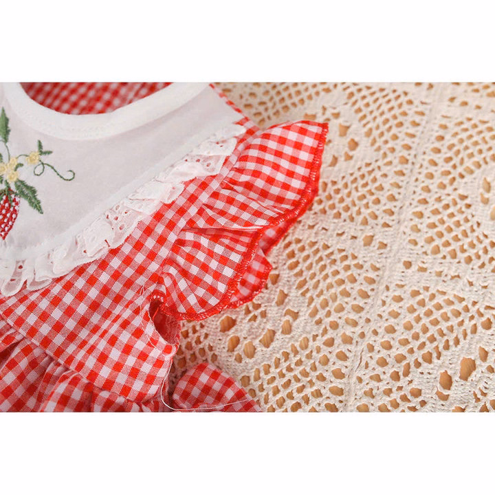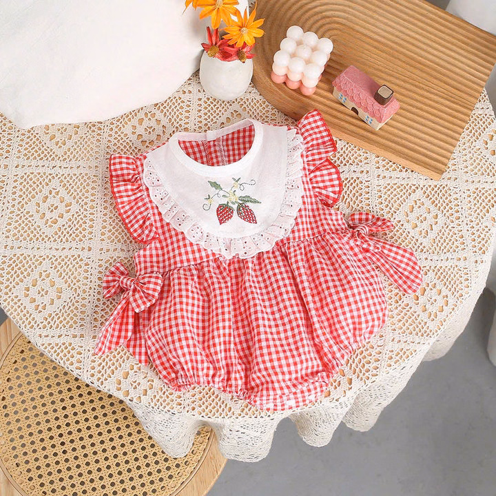 – Thiết kế : Body cổ yếm với kiểu dáng dễ thương, giúp bé gái sơ sinh thoải mái vận động và dễ dàng thay đồ. Hoạ tiết caro cổ điển kết hợp với hình dâu tây xinh xắn, tạo điểm nhấn nổi bật và đáng yêu cho bé