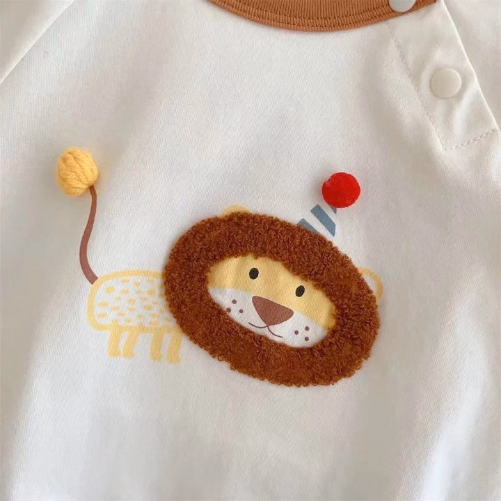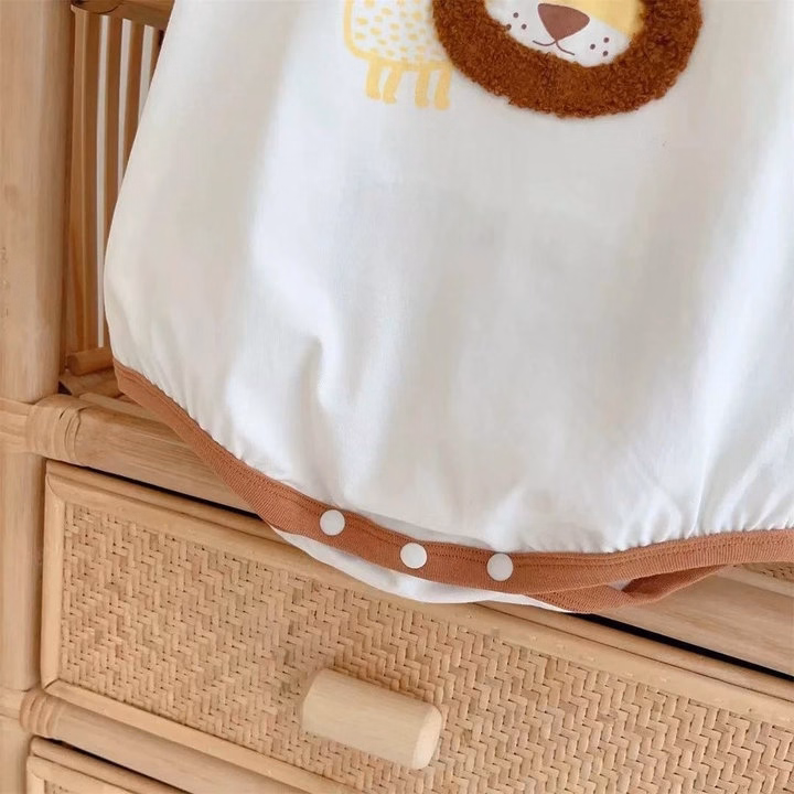 – Thiết kế : Dáng body liền quần ngắn tay, viền nâu đất quanh cổ áo, tay áo và gấu quần tạo điểm nhấn nổi bật. Phía trước in hình sư tử đội mũ sinh nhật, kết hợp chất liệu lông mềm ở bờm sư tử cực kỳ dễ thương, tăng sự thú vị cho bé. Có nút bấm ở vai và đáy giúp thay đồ và thay tã nhanh chóng, tiện lợi.