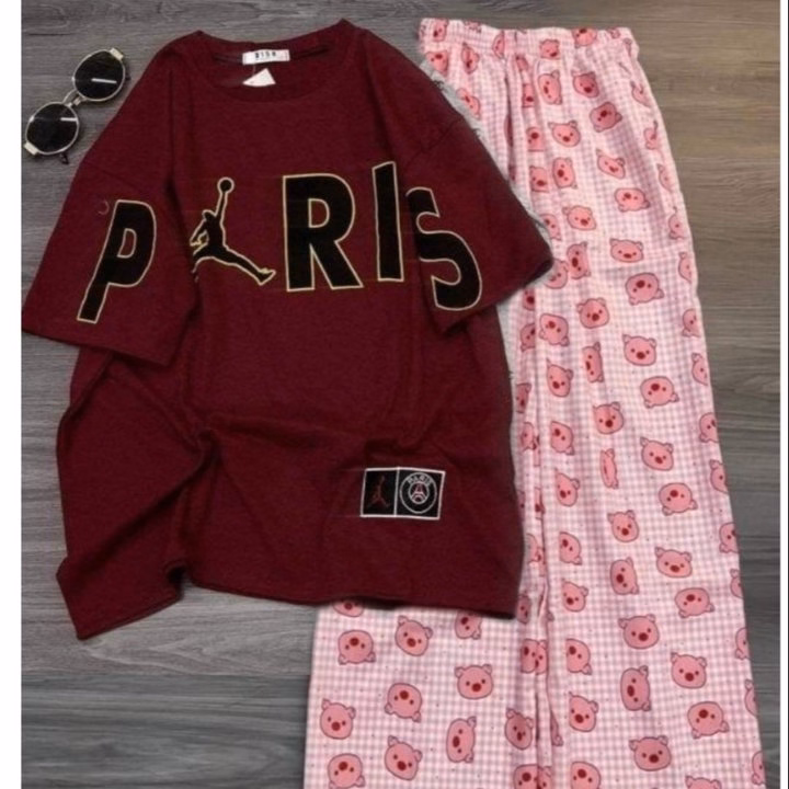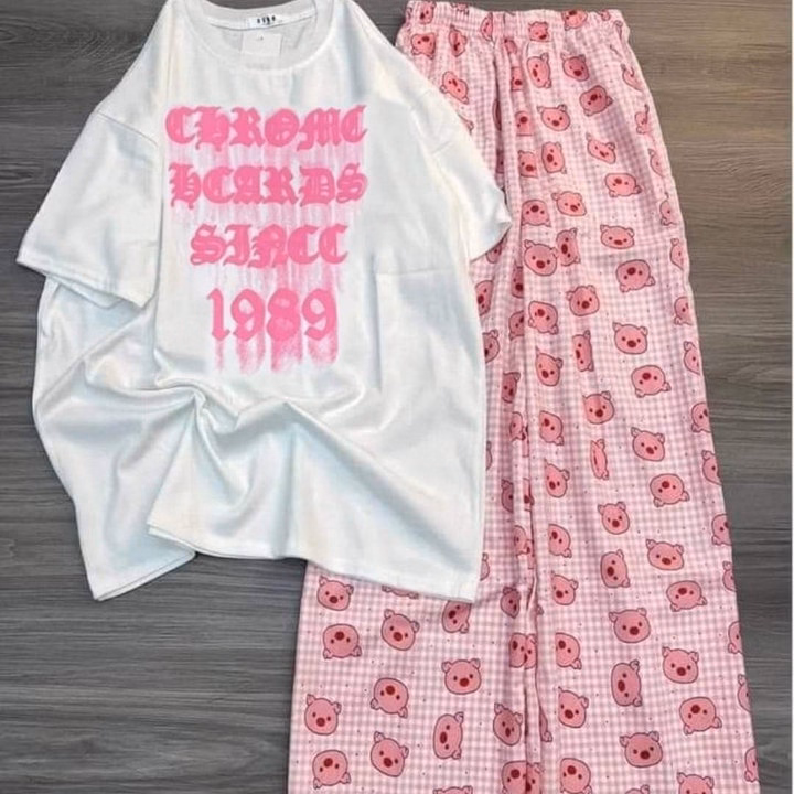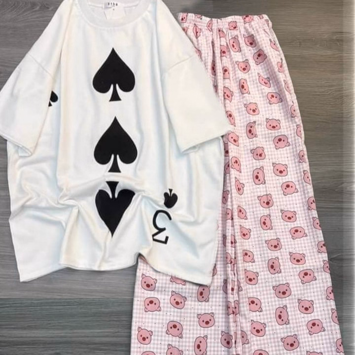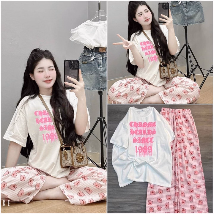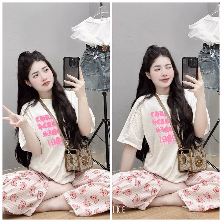 Các Sét Bộ Nữ Quần Hoạt Hình Heo Hồng + Mix Áo Phông Form Rộng Unisex