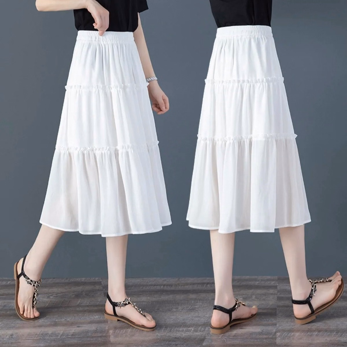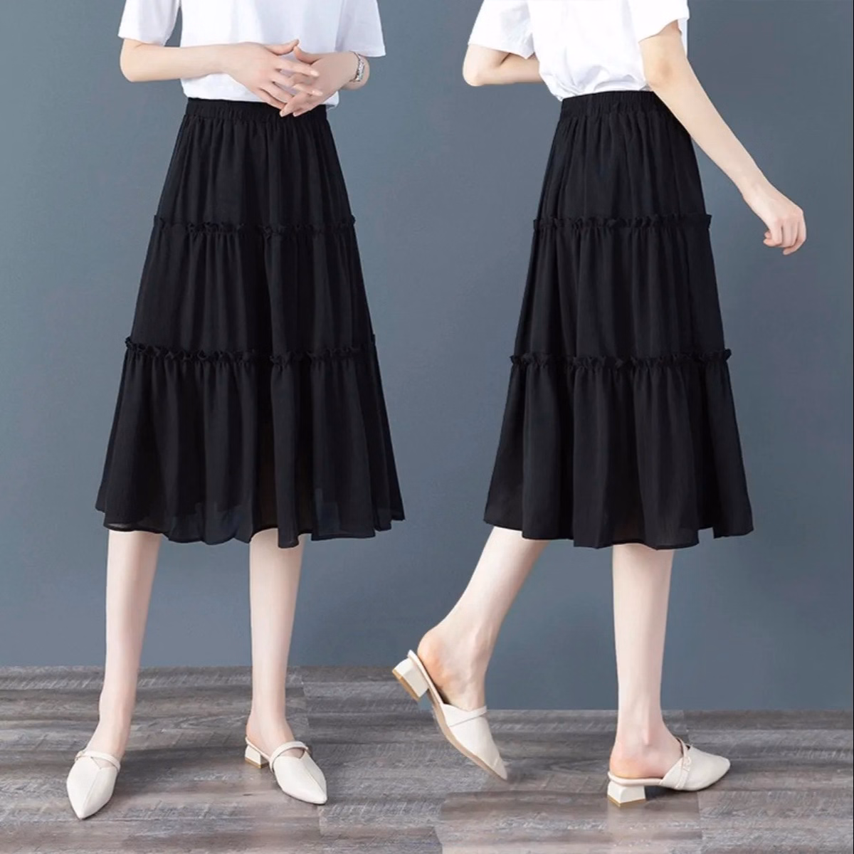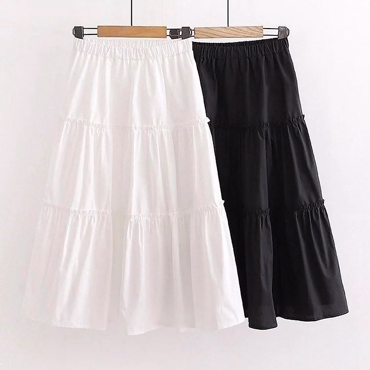 Chân váy nữ 3 tầng midi trơn, phối bèo nữ tính