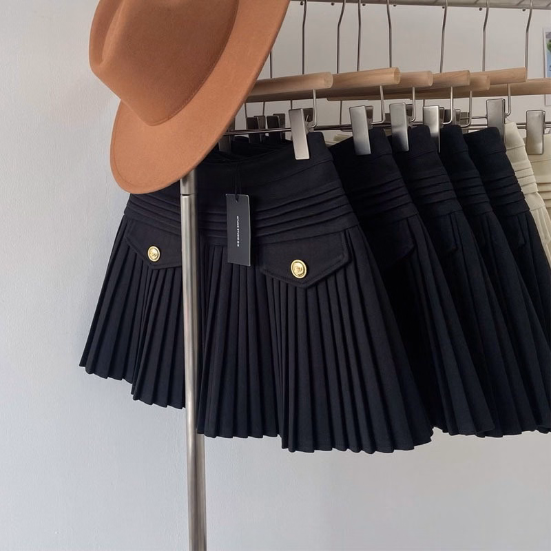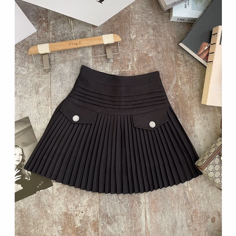 Chân Váy Xếp Ly Cạp Cao Dáng Ngắn 2 Nắp Túi Trước Sang Chảnh
