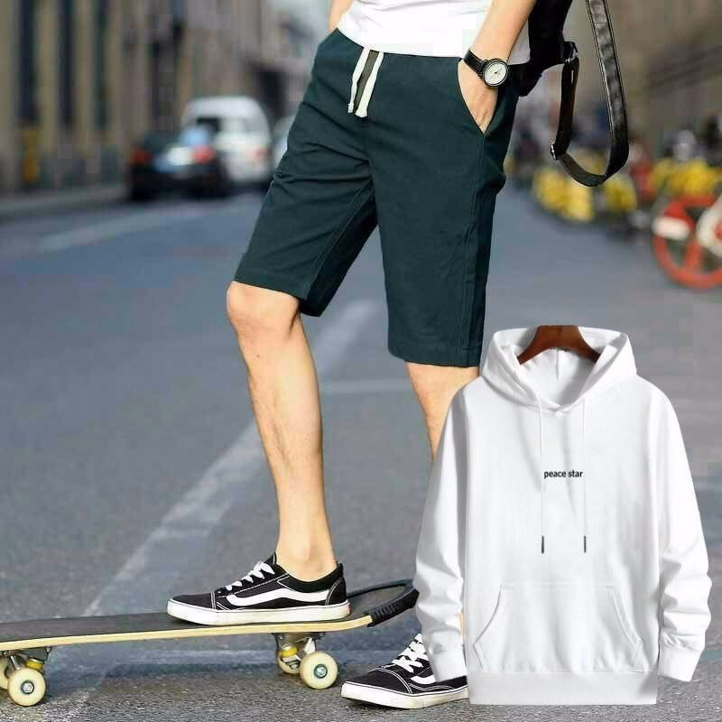 Combo áo thun hoodie Peace Star và quần lửng nam kaki trơn, sự kết hợp hoàn hảo cho phong cách thời trang năng động, trẻ trung của bạn.