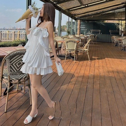 Tên sản phẩm: Đầm 2 Dây Cột Nơ Dập Ly 2 Lớp , Lụa Bóng Cao Cấp V991H