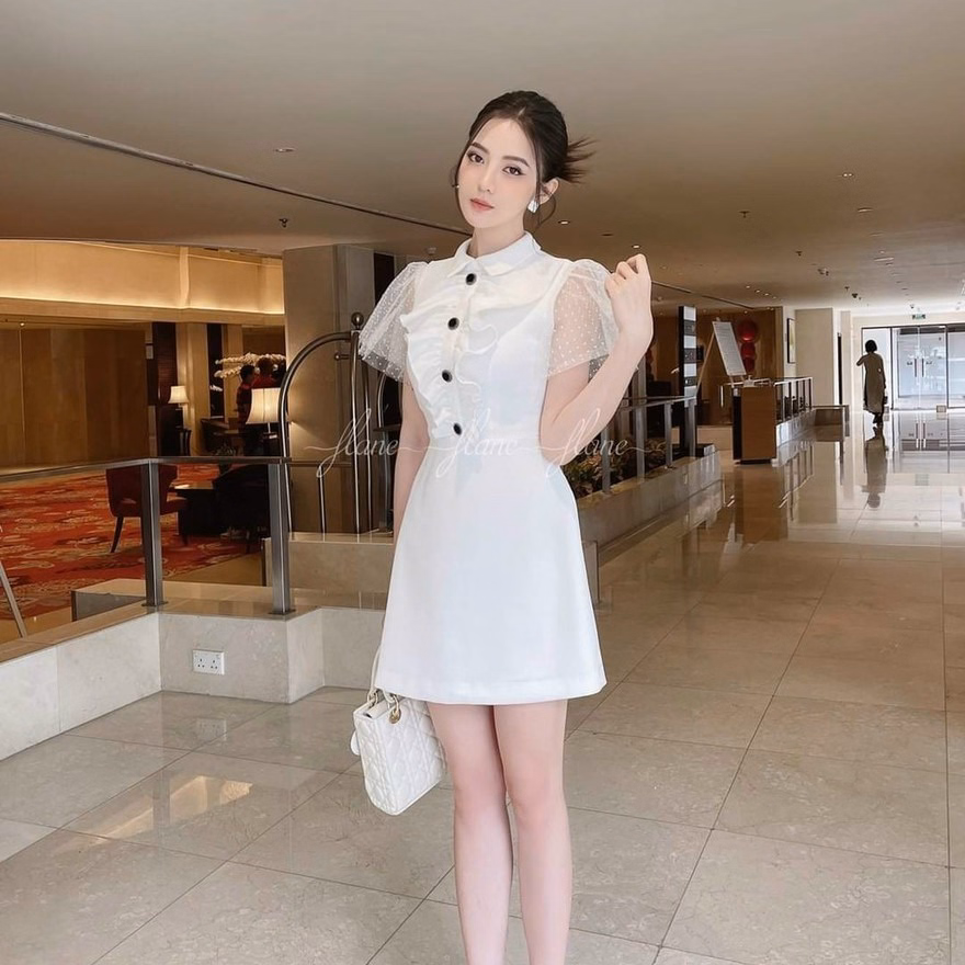 Đầm Bèo Cổ Đính Nút Phối Tay Lưới Mè V42- Haka Mây
