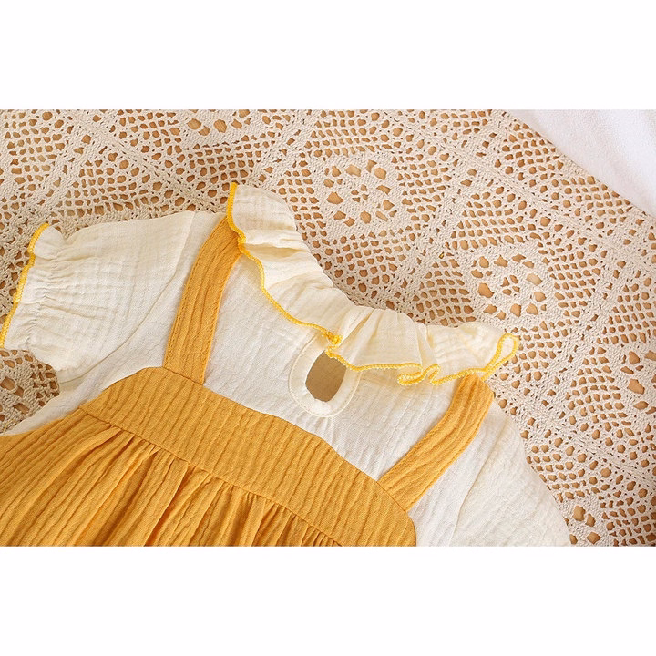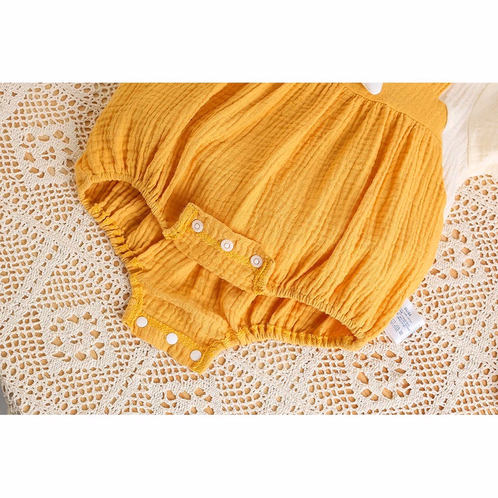 – Chất liệu: Vải muslin (vải xô) cao cấp – mềm mịn, thoáng khí, siêu nhẹ và thấm hút tốt. Không gây kích ứng da nhạy cảm của trẻ sơ sinh. Màu sắc và họa tiết: Áo màu kem phối vàng chanh nhẹ ở viền cổ và tay áo. Váy yếm màu vàng nghệ nổi bật, trang trí thỏ trắng cực kỳ đáng yêu.