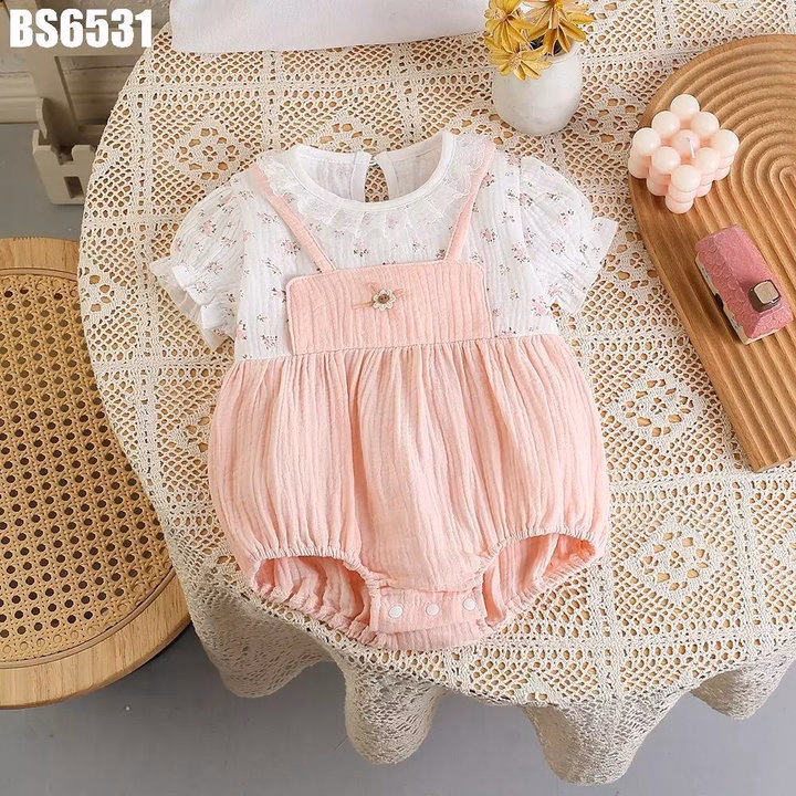 – Thiết kế : Dạng liền thân kết hợp kiểu áo giả yếm xinh xắn. Phần trên là áo cổ bèo tay ngắn bo viền, phần dưới là váy giả yếm có dây đeo, chính giữa ngực đính hình thỏ dễ thương. Nút bấm giữa đũng thuận tiện thay tã.