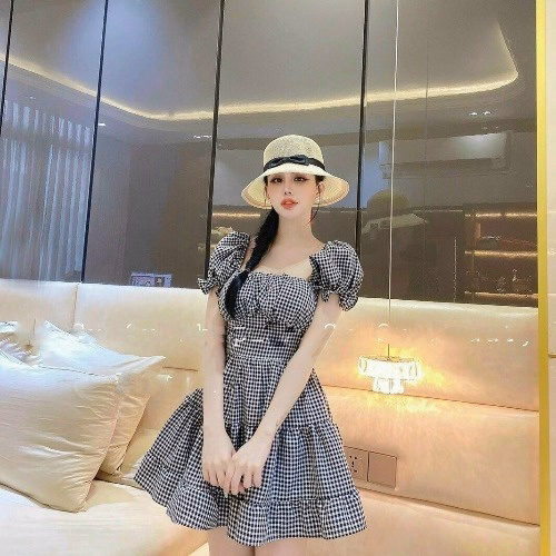 Đầm Caro Tầng Thì Ngắn Tay Bồng Màu Đen V67 – Cloudy Dress