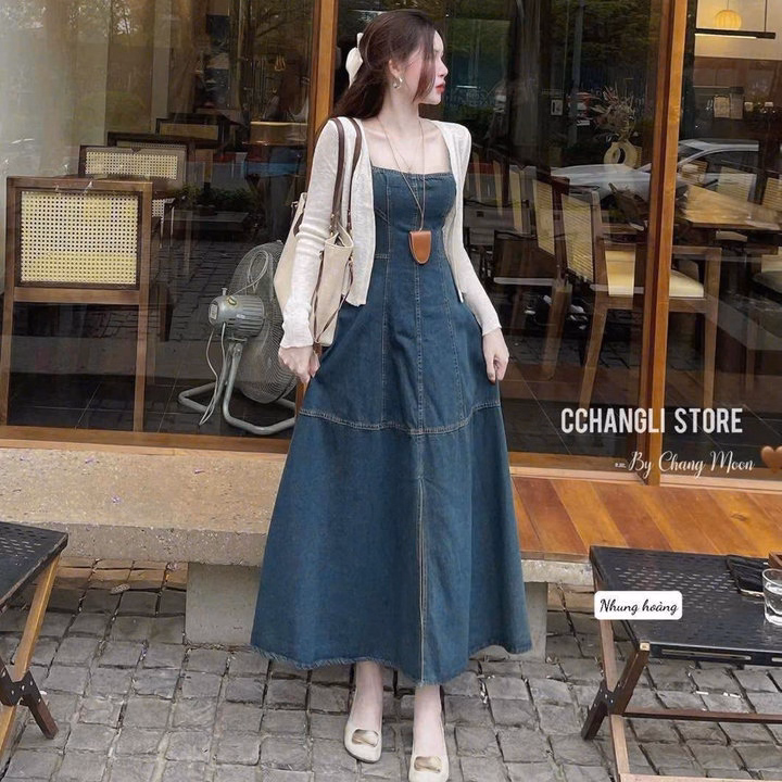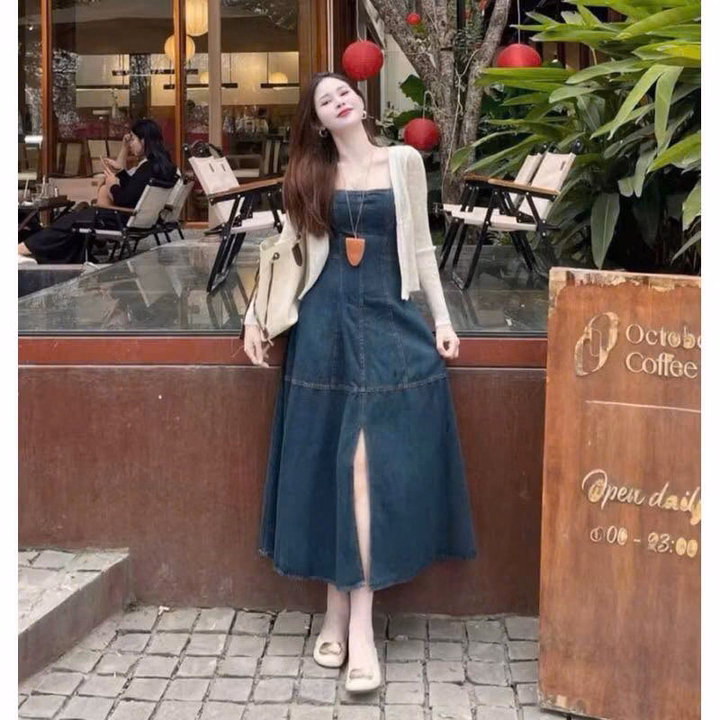 Đầm Denim 2 Dây Dáng Dài Xẻ Tà Kèm Áo Khoác Len Ren Tb125Mg-Nana House