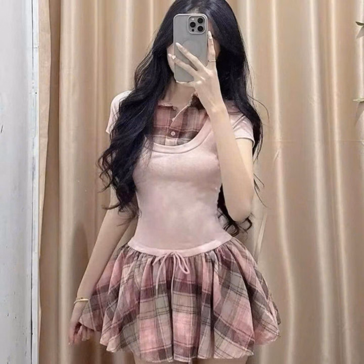 Đầm Đũi Caro Cổ Bẻ Phối Tăm Lạnh Khóa Kéo Đính Nơ Kèm Quần Rời Tb86Dr-Nana House