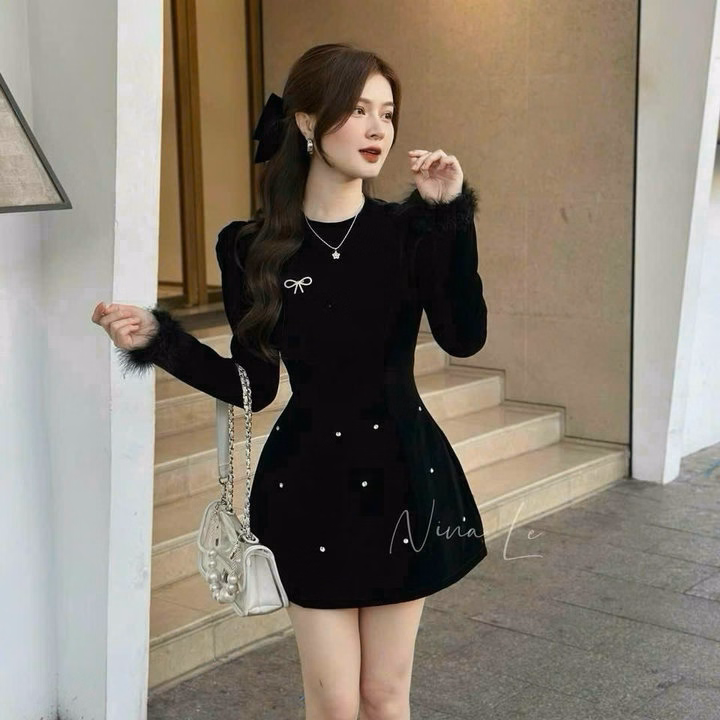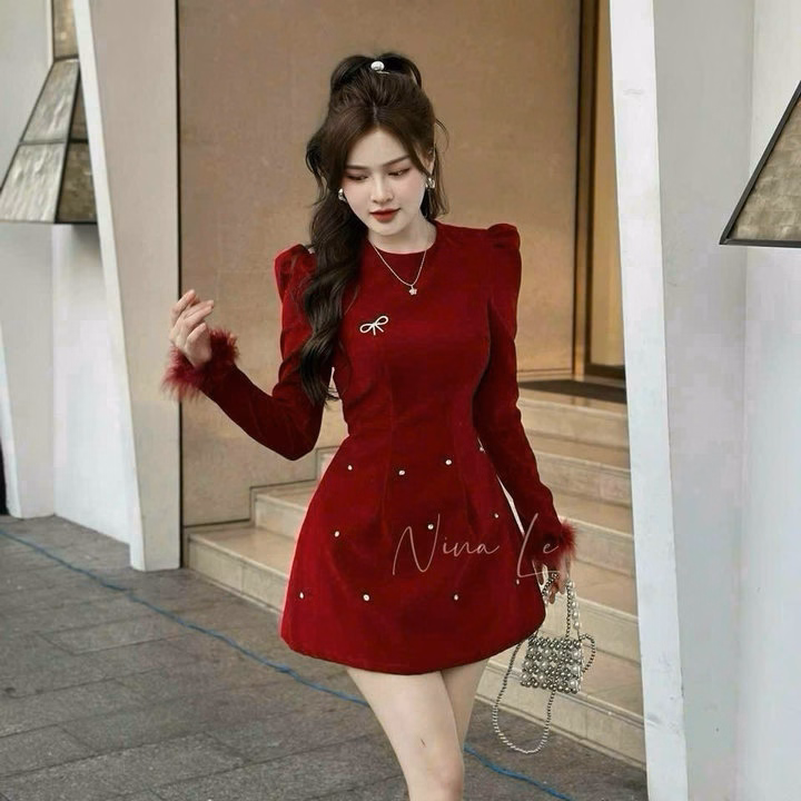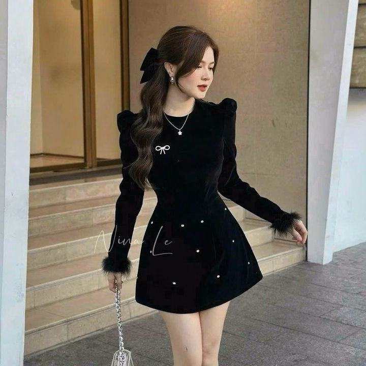 Đầm Nhung Cứng Cổ Tròn Tay Dài Có Lông Tay Bh1100 – Nana House