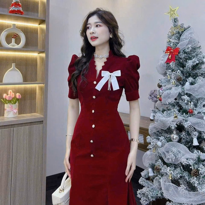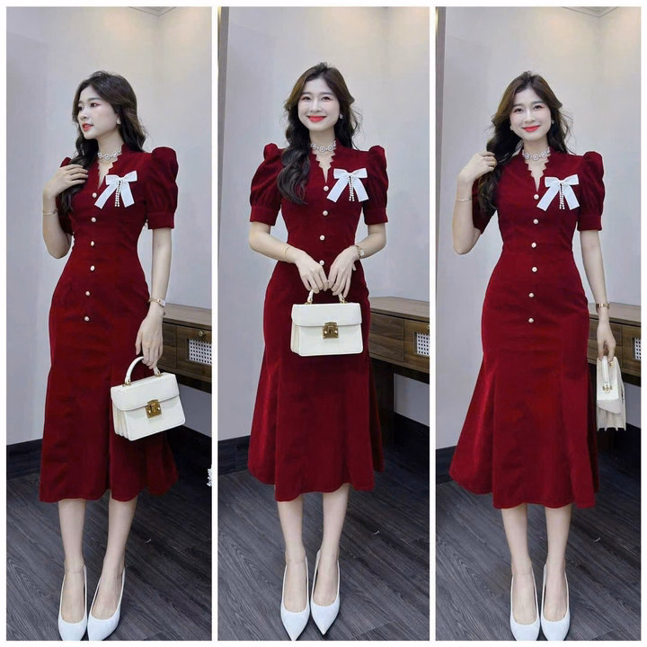 Đầm Nhung Đuôi Cá Tay Phồng Đính Nơ Bht1005 – Nana House