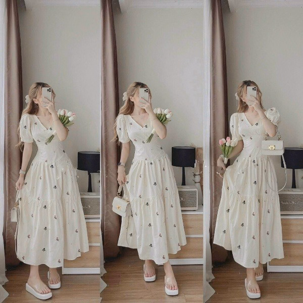 Tên sản phẩm: Đầm Nữ Cổ Tim Tay Ngắn Dáng Xòe Chất Lụa Hoa M543