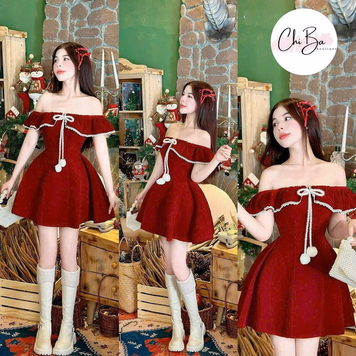 Đầm Nữ Vải Nhung Trễ Vai Phối Lai Bèo Thắt Nơ Siêu Xinh Xắn Tp60 – Golden Dream