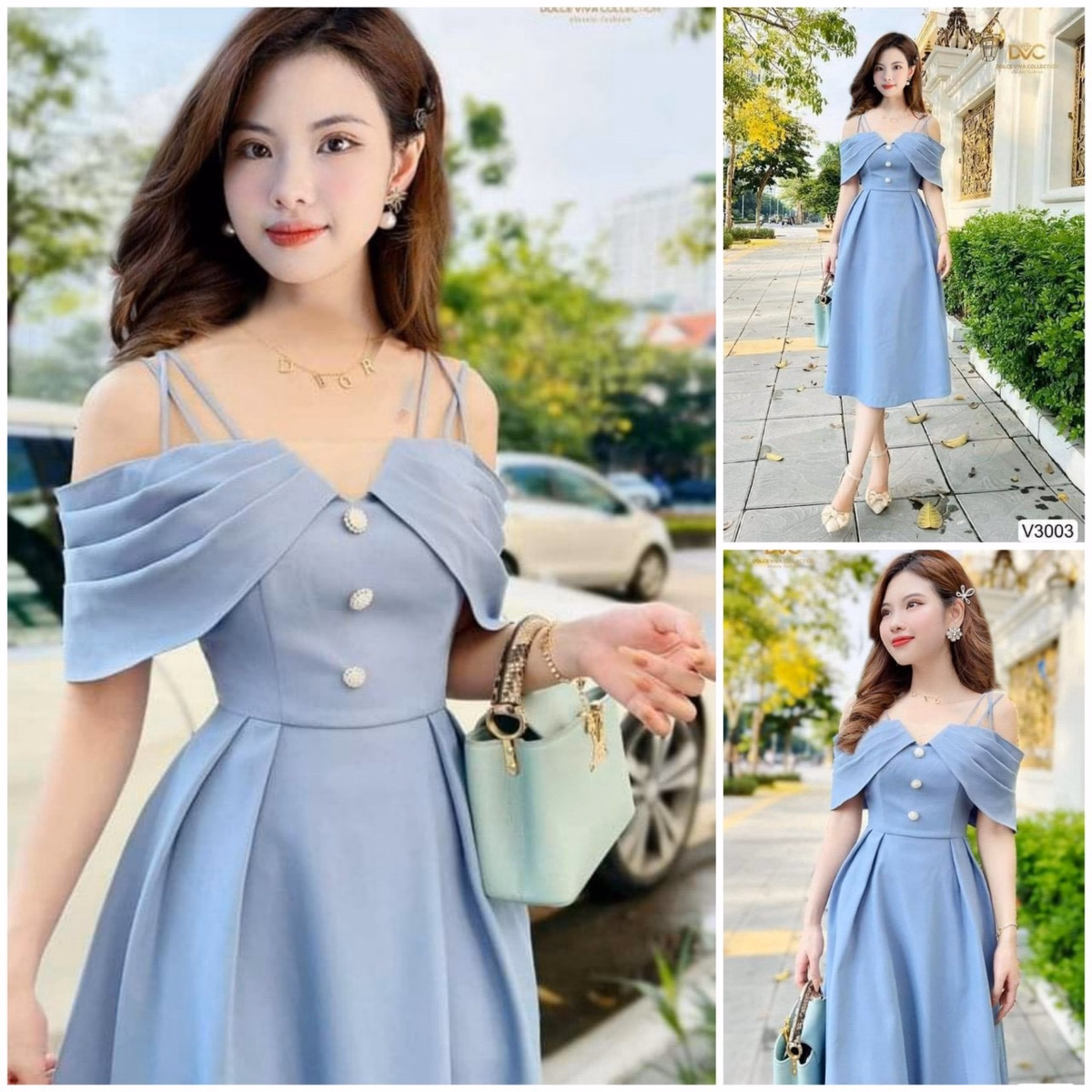 Đầm Phối Lưới Kim Sa Đan Dây Vai V978H – Aine