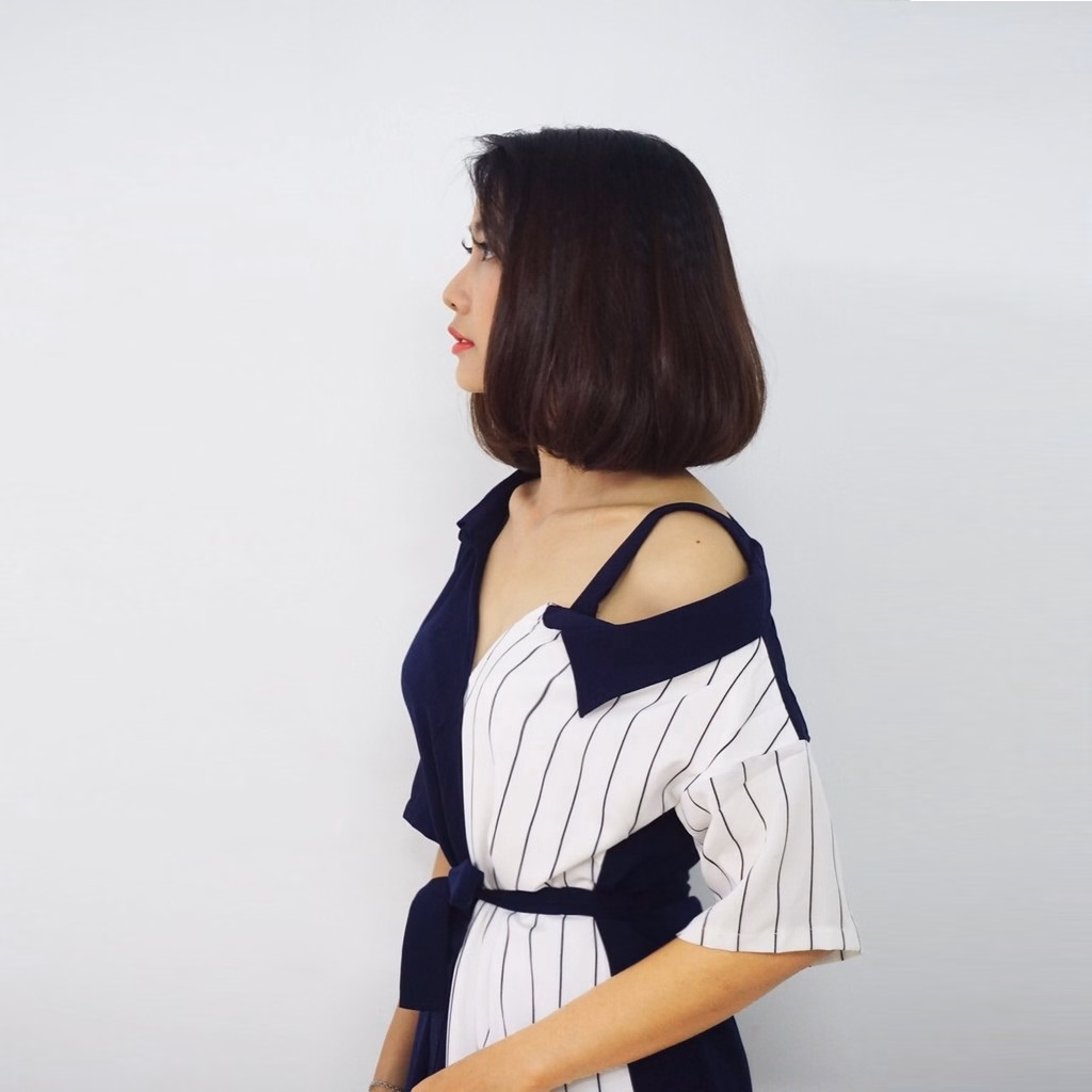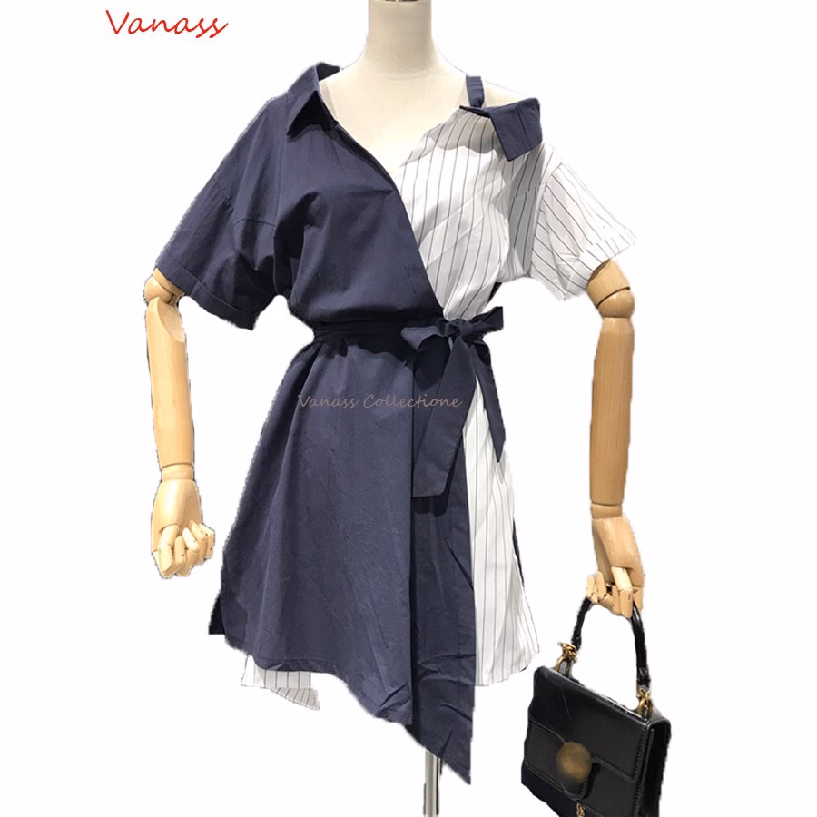 Tên sản phẩm: Đầm Phối Sọc Thắt Nơ Eo Phối Xanh – Vanass