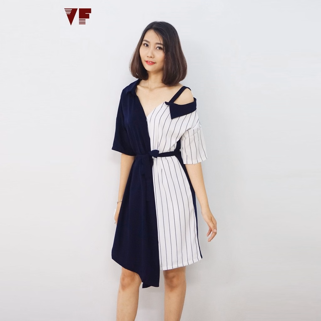 Đầm Phối Sọc Thắt Nơ Eo Phối Xanh – Vanass