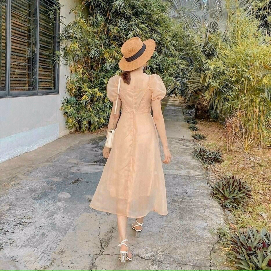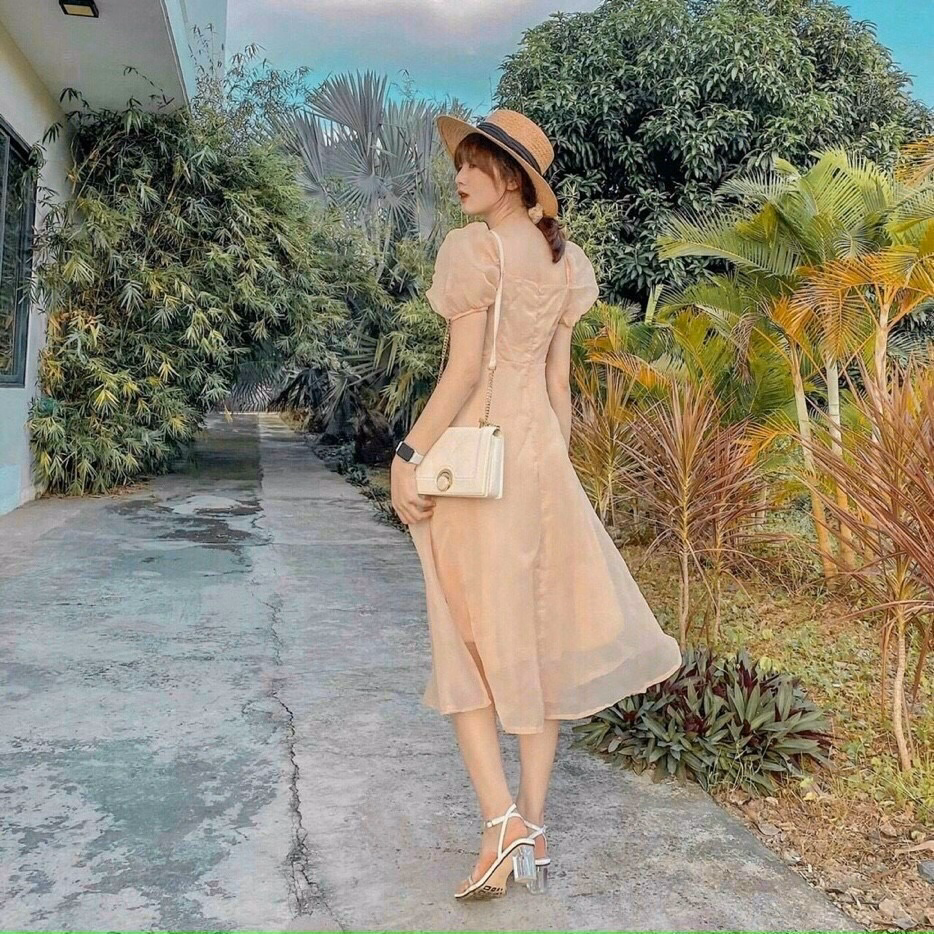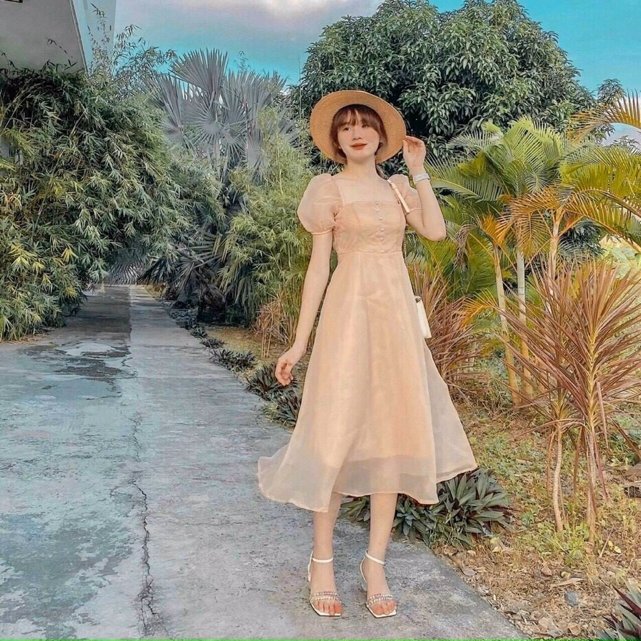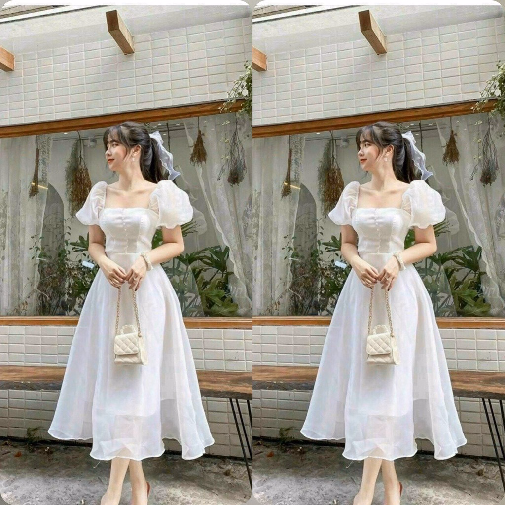 Đầm Tiểu Thư 2 Lớp Siêu Xinh Phối Cổ Vuông Tay Phồng Đính Cườm Vải Voan Tơ Bóng V186 – Aine