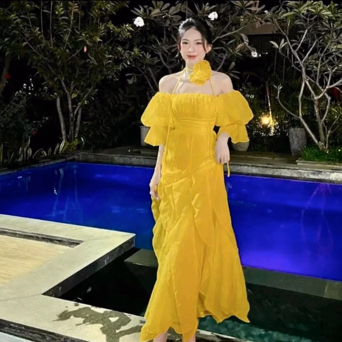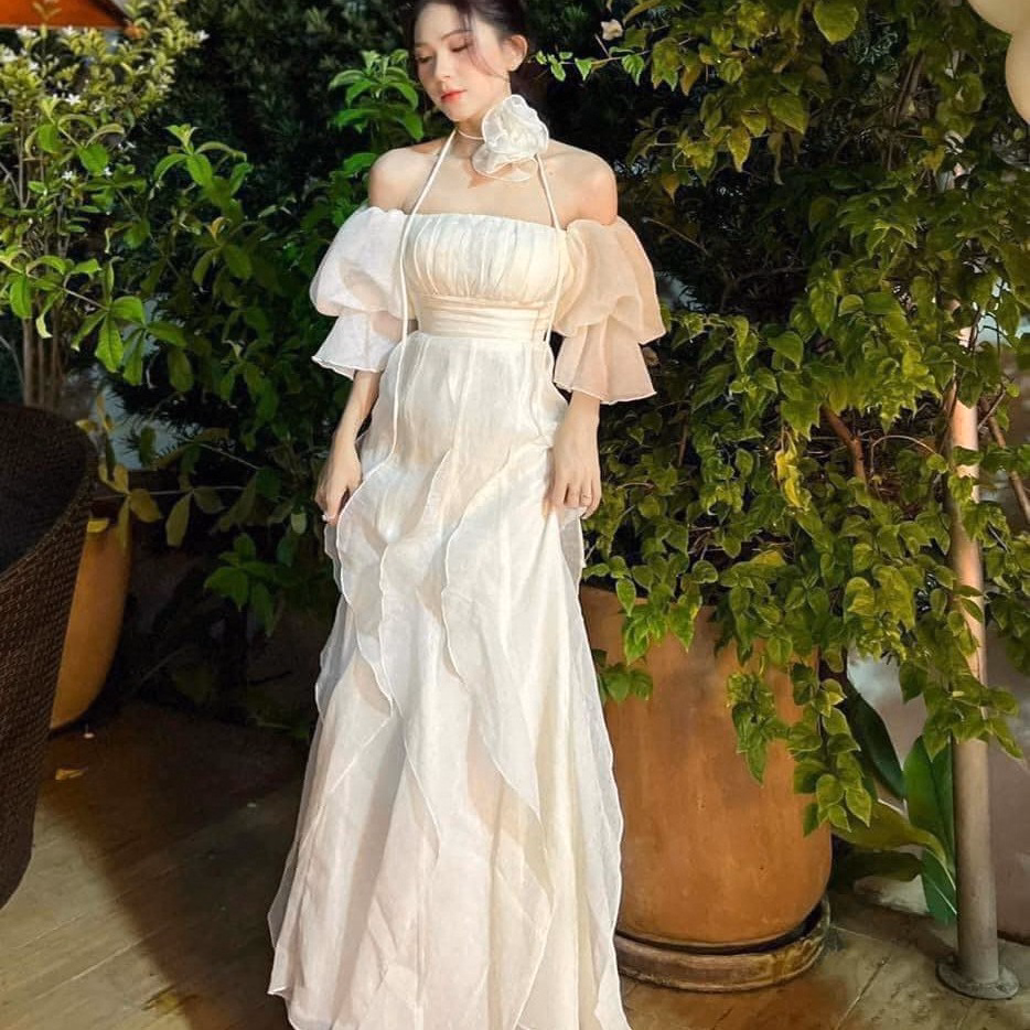 Đầm Váy Nữ Voan Tay Phồng Rớt Vai Phối Hoa Đeo Cổ Sa511 – Sam Store