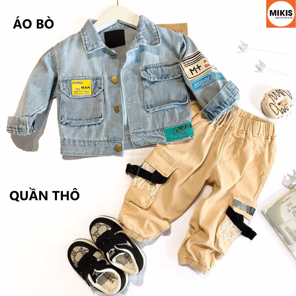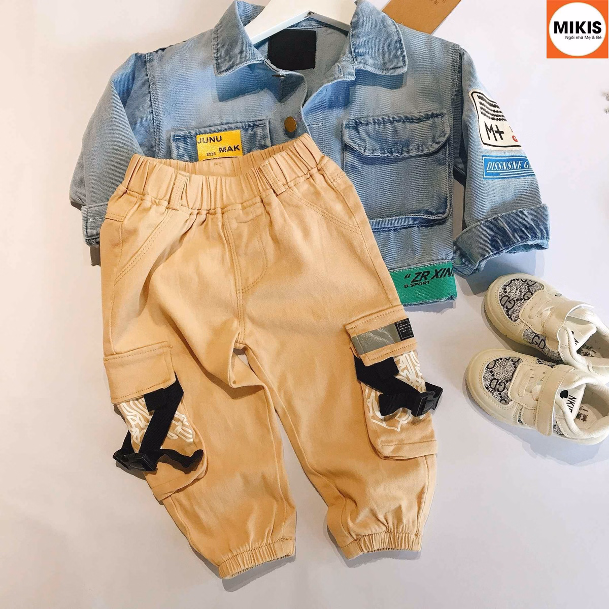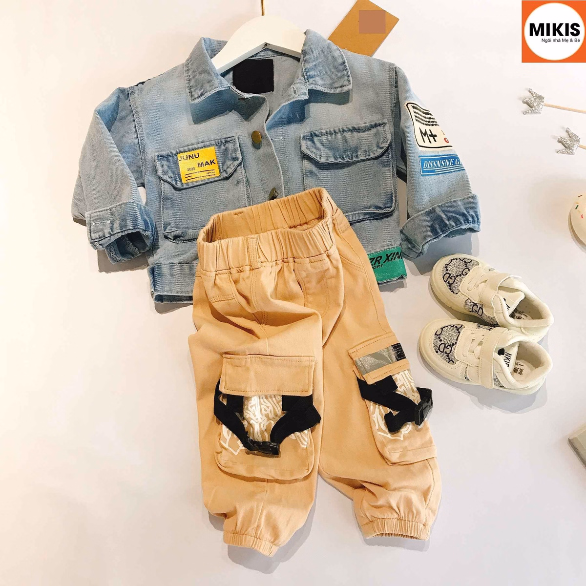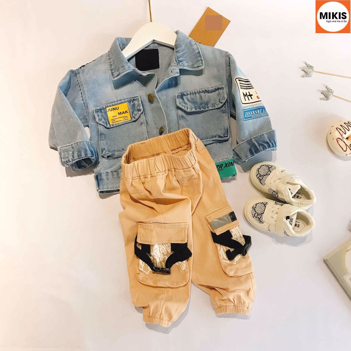 Áo khoác jean xanh. Quần thô túi hộp. Phù hợp cho bé trai, bé gái thích phong cách tomboy mặc đi chơi, đi tiệc, đi học.