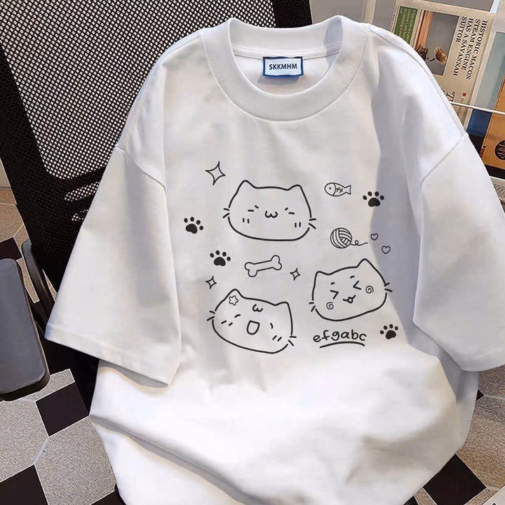– Tên Sản phẩm: Áo phông form rộng tay lỡ chất vải cotton , áo cổ tròn nam nữ unisex – Hình 3 con mèo trắng