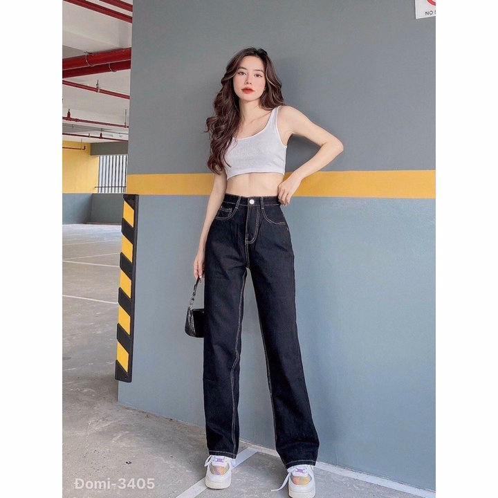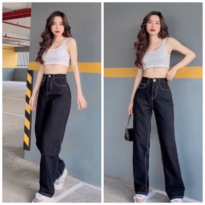 Quần Bò Ống Rộng Chỉ Nổi Viền Đen