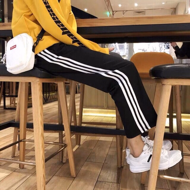 Thiết kế dáng quần thể thao phối 3 sọc kẻ trắng sườn quần.