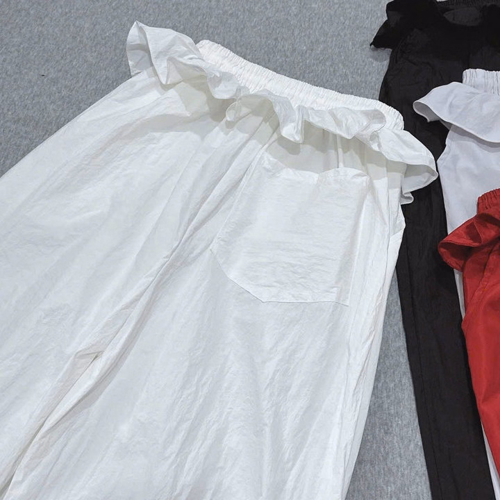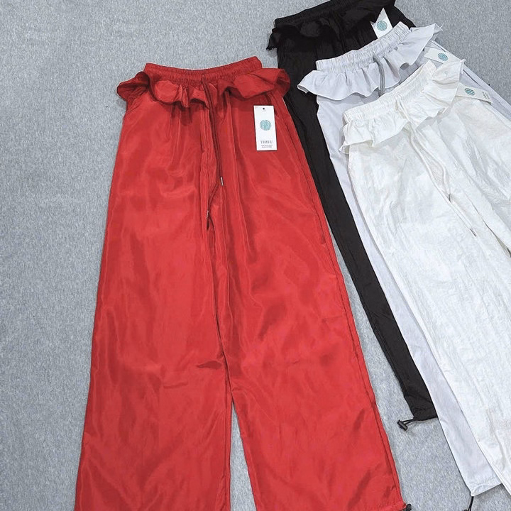 Quần Dài Ống Rộng Chất Dù Nhăn Gió Phối Bèo Ở Lưng Eo Co Giãn Có Dây Rút Hàng Đẹp