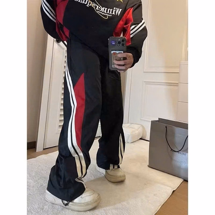 Quần Dù Phối Đỏ Hai Sọc Ống Rộng Lưng Cao Nam Nữ Unisex Gu62Ew-Nana House