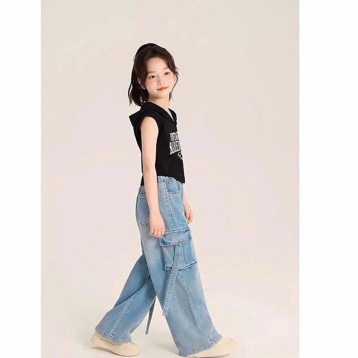Quần Jean Ống Suông Túi Hộp Dây Bé Gái Phong Cách Hàn, Jean Cotton Mềm Nhẹ – 2 Màu Cá Tính Từ 18-50kg Dành Cho Bé Gái