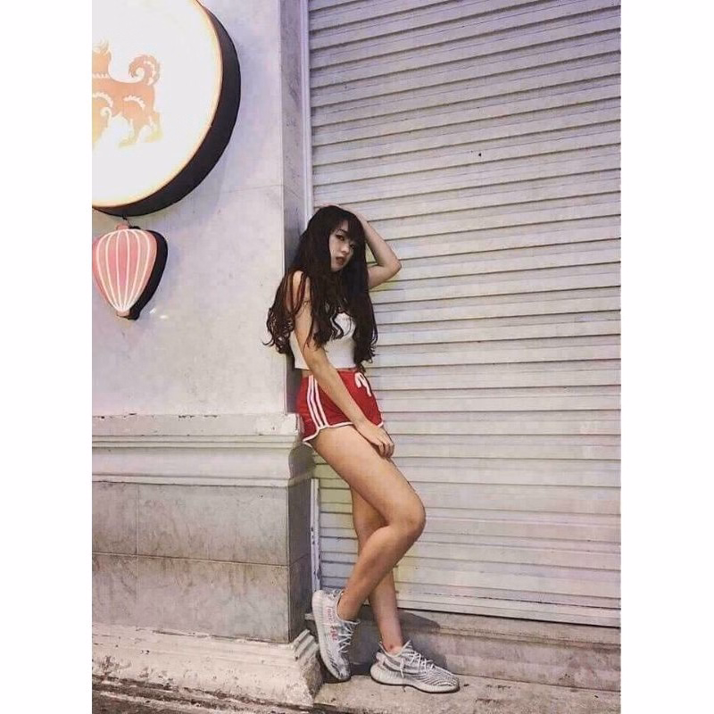 Dáng: quần short trên đầu gối, có sọc trắng cạnh sườn