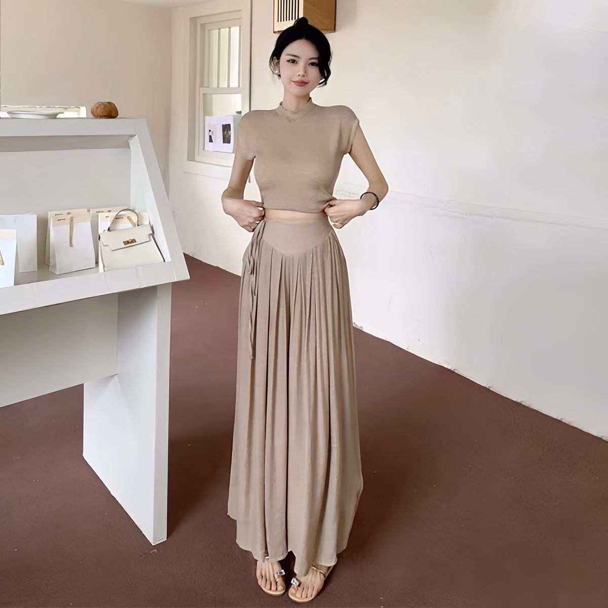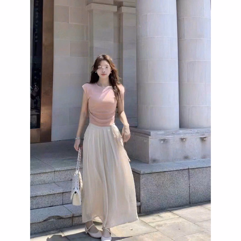 Thiết kế dạng quần váy thời trang, có xếp ly nhẹ ở cạp, tạo độ phồng nhẹ, siêu hack dáng