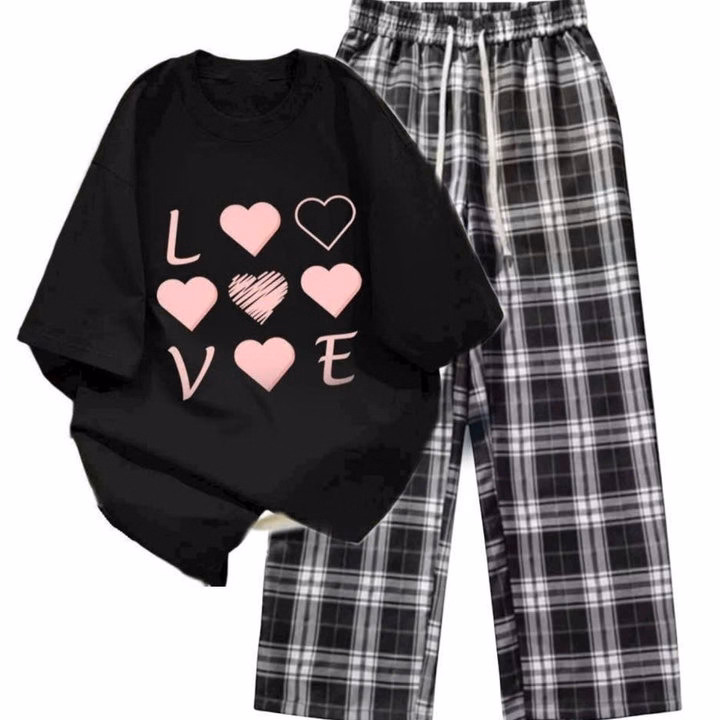 [ Rá Mở Bán ] Sét Bộ Mùa Hè Quần Kẻ Caro Bản To Đen+Mix Áo Phông Form Rộng Tay Lỡ – Chữ Love