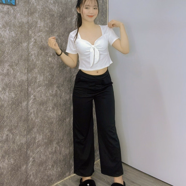 [ Rẻ Vô Địch ] Sét Bộ Đồ Quần Ống Rộng Cạp Chun Hack Dáng Đen + Mix Áo Thun Chất Tăm Hàn Có Đệm Mút Thắt Nơ Xinh Xắn