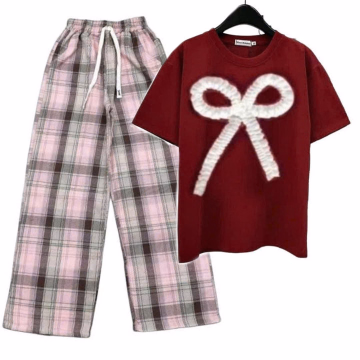 [ Rẻ Vô Địch ] Tổng Hợp Các Sét Bộ Quần Ống Rộng Kẻ Caro + Mix Áo Phông Form Rộng Thêu Hình Nơ Dúm