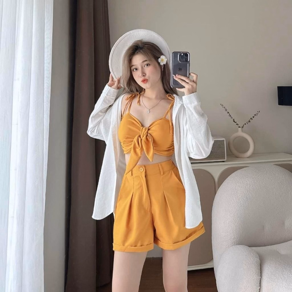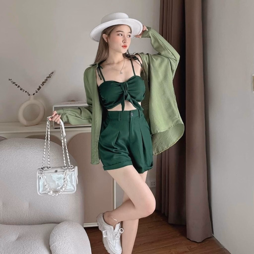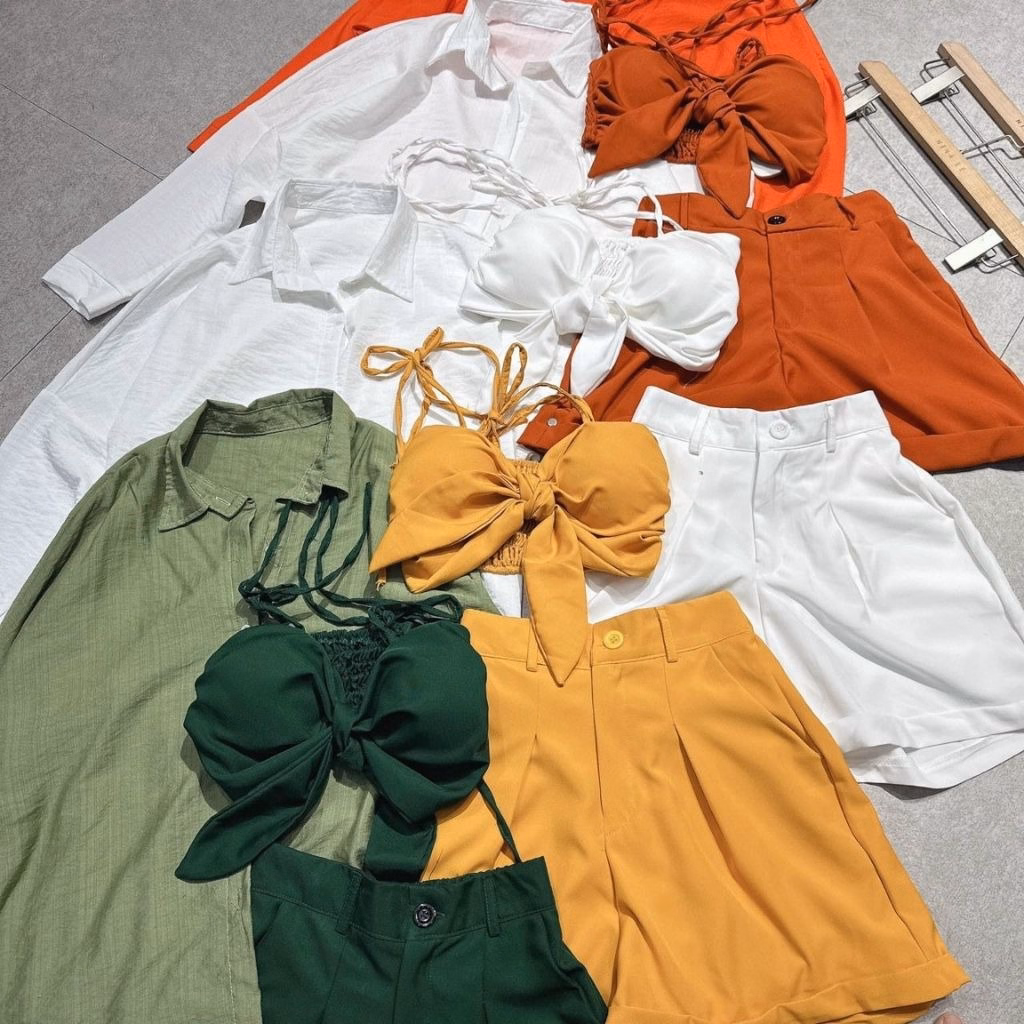 Tên sản phẩm: Set 3 Món Đi Biển Áo Sơ Mi Kèm Áo Croptop Kèm Quần Short M715