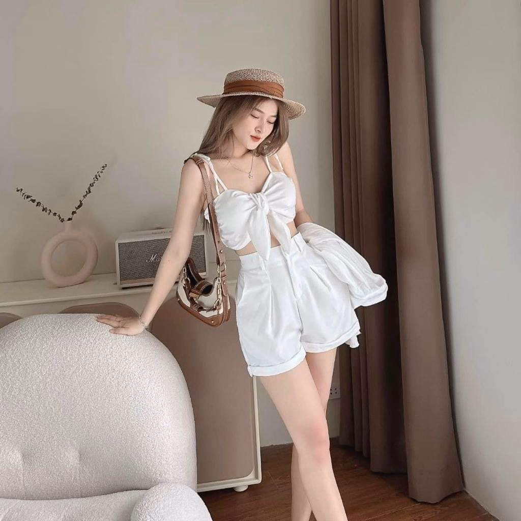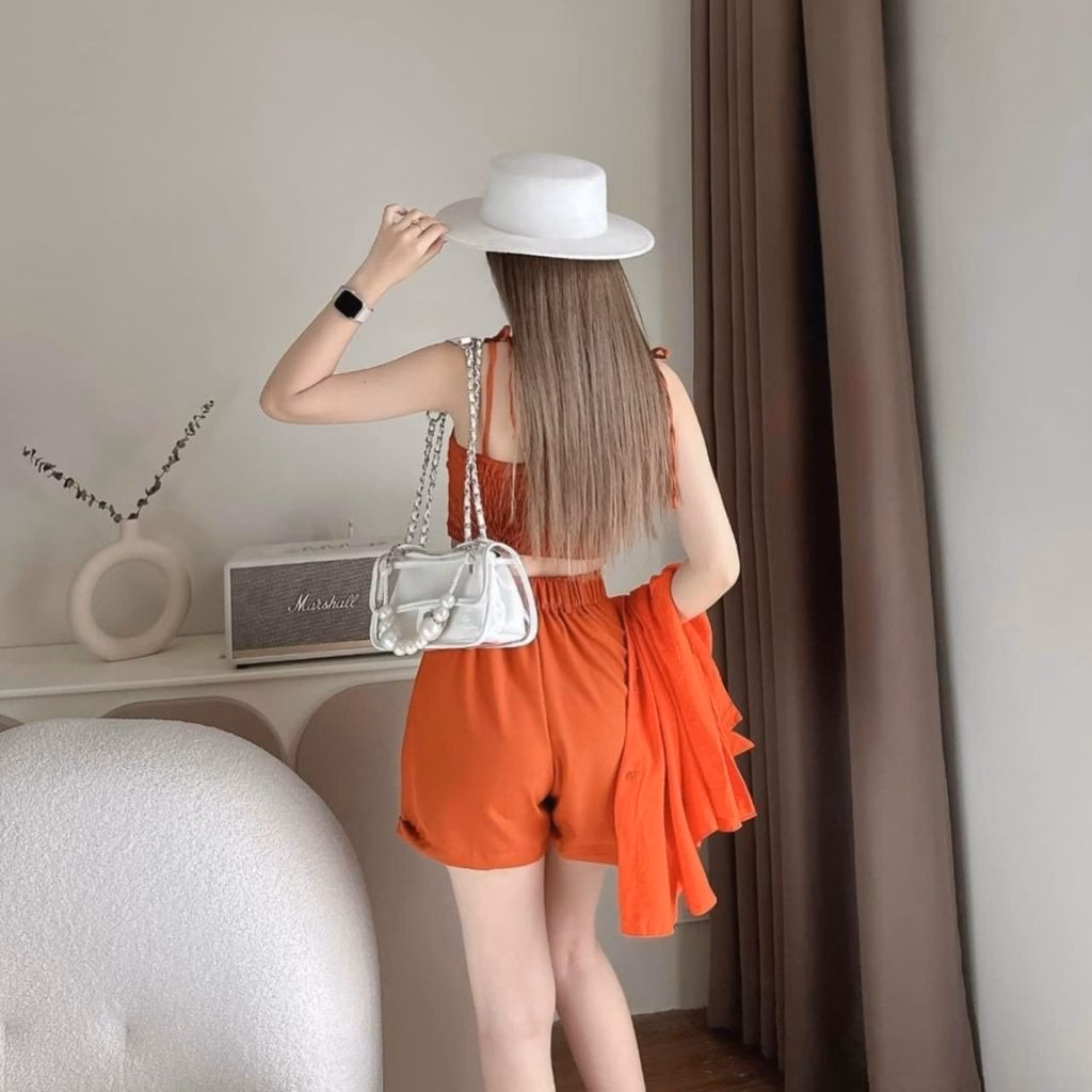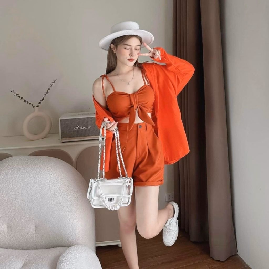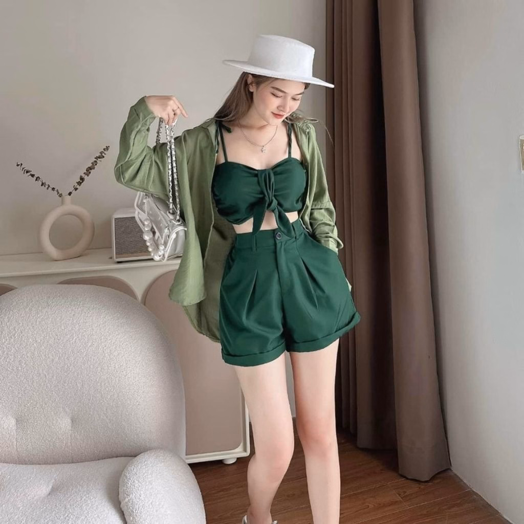 Tên sản phẩm: Set 3 Món Đi Biển Áo Sơ Mi Kèm Áo Croptop Kèm Quần Short M715