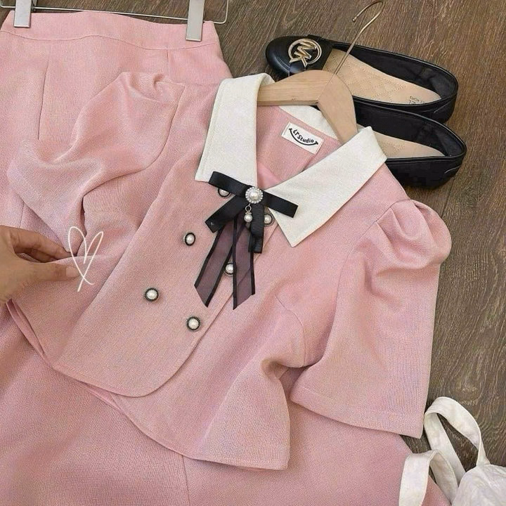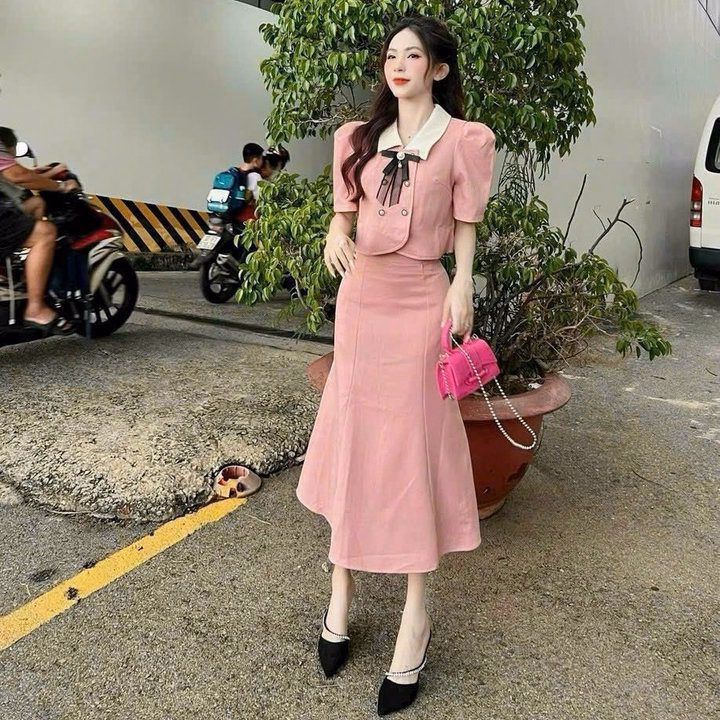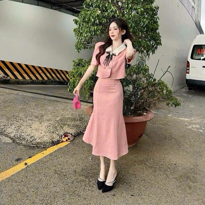 Set Áo Cài Nút Kèm Nơ Phối Chân Váy Đuôi Cá Bh100Y- Nana House