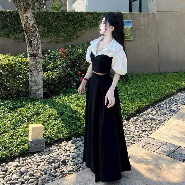 Set Áo Cổ Lá Phối Cổ Phối Tay Kèm Chân Váy Xòe Dài Q36- Sam Store