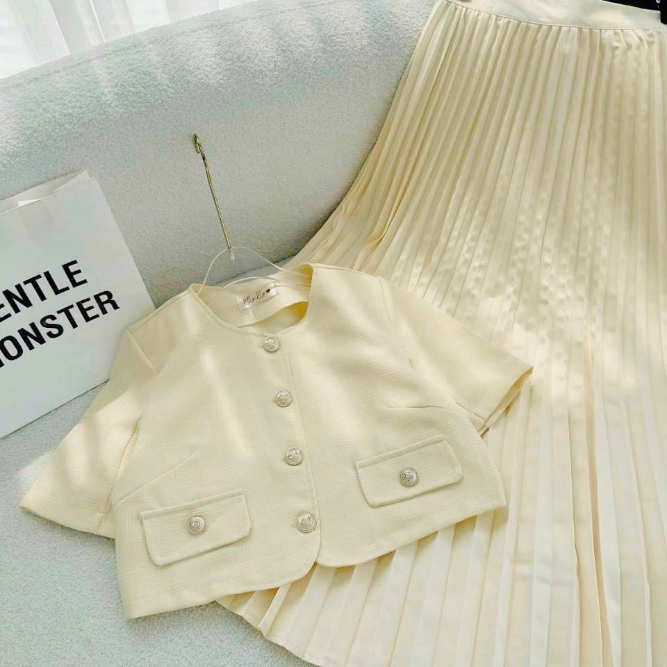 Set Áo Cổ Tròn Linen Crotop Mix Chân Váy Lụa 2 Lớp Dập Ly Hàn Quốc Sa97 – Sam Store