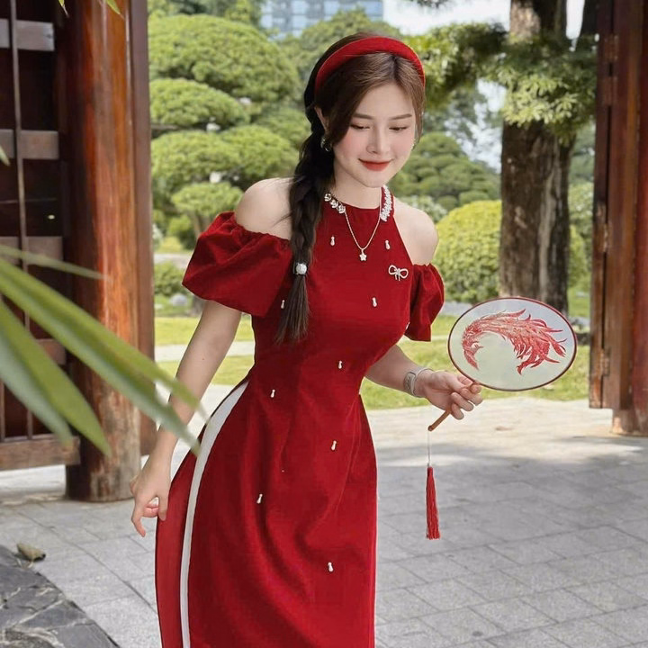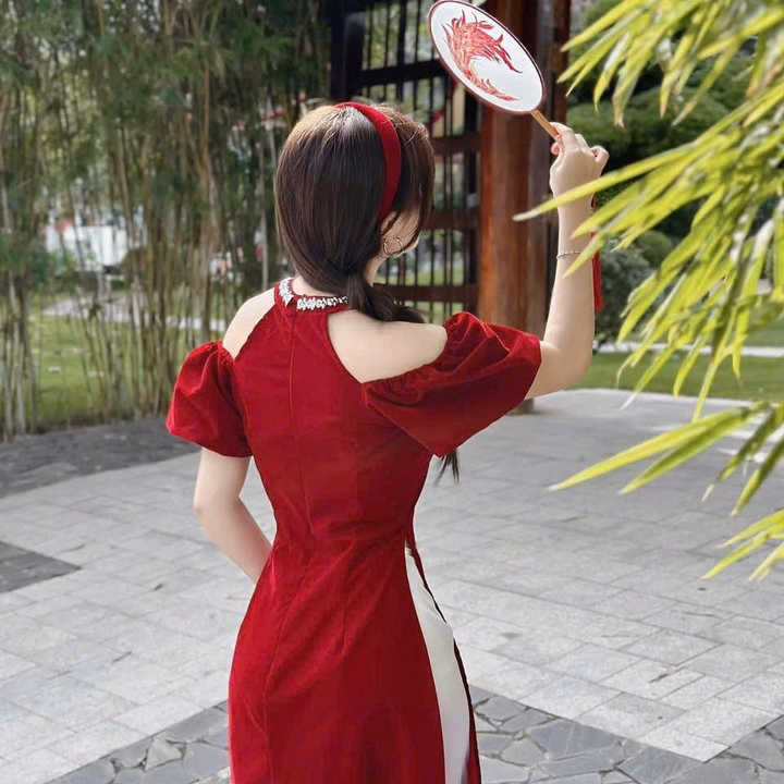 Set Áo Dài Cách Tân Nhung Cổ Yếm Đính Phụ Kiện Q17-Sam Store