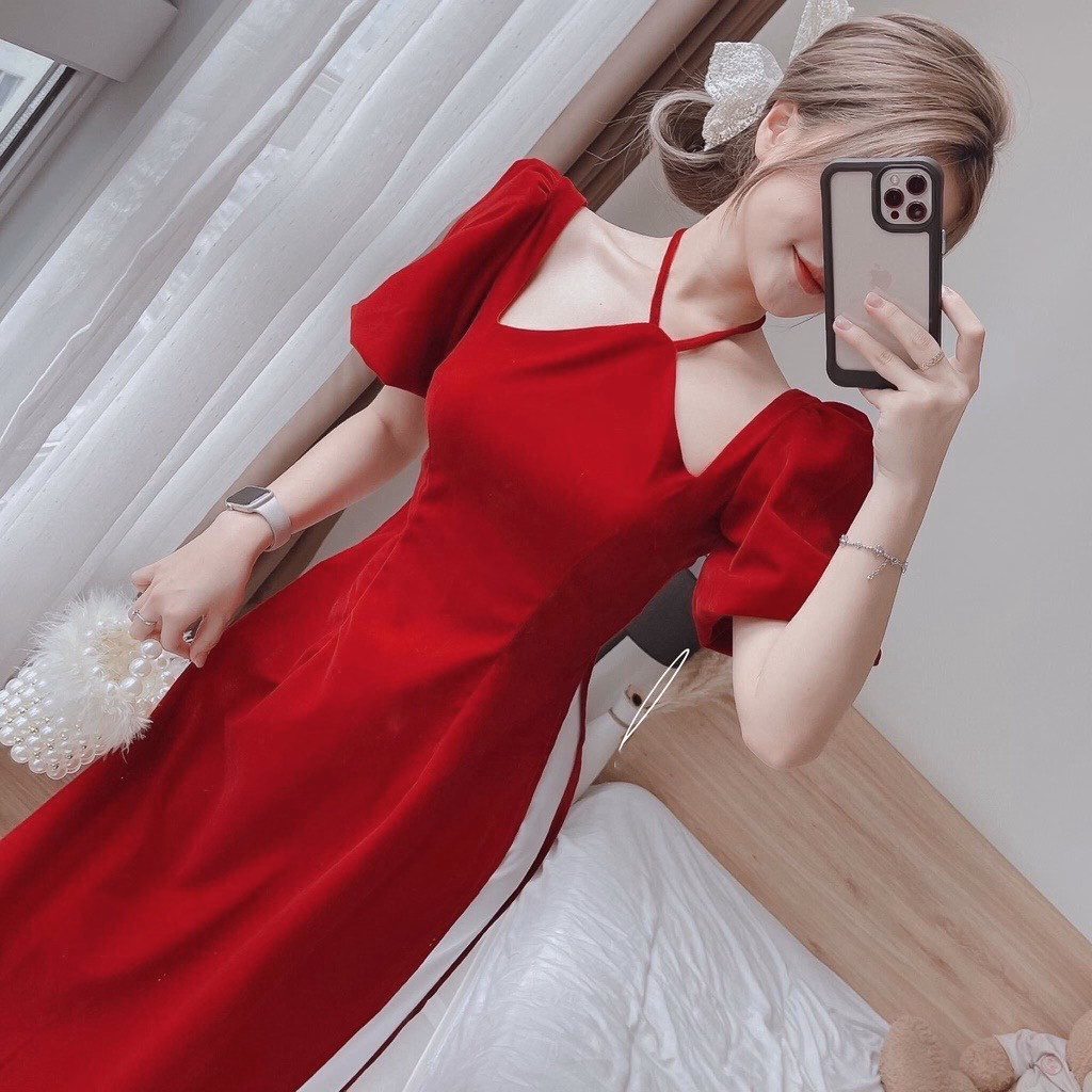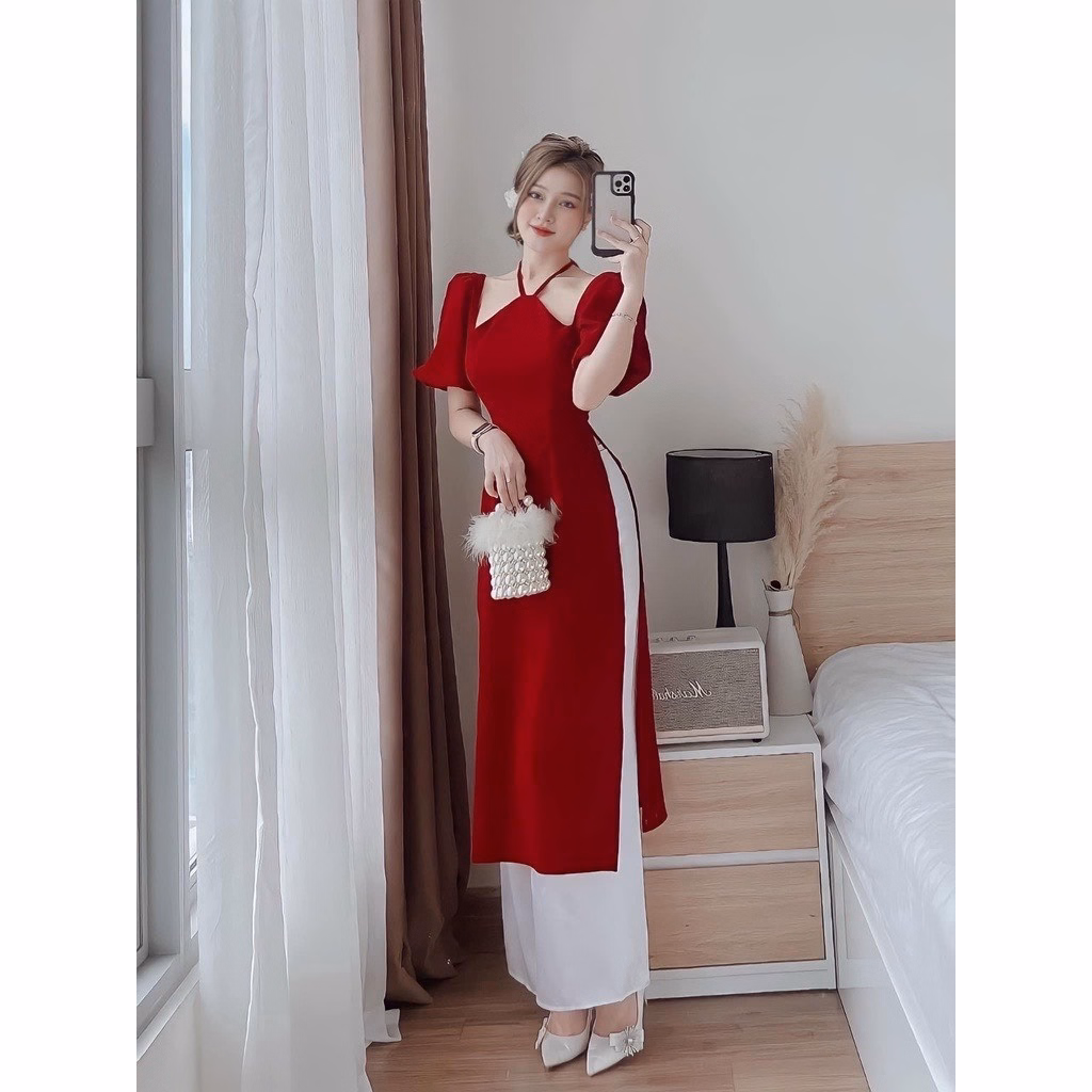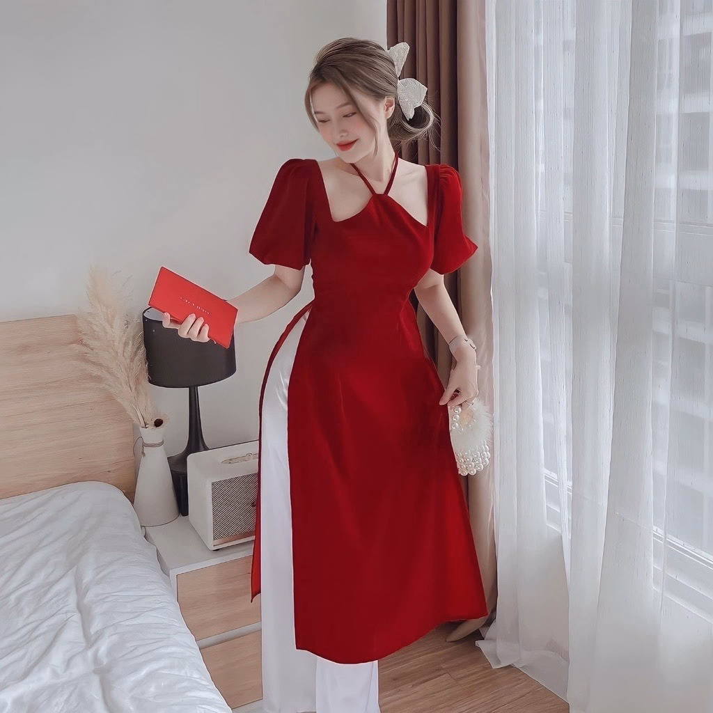 Set Áo Dài Cách Tân Nhung Đỏ Tay Phồng Cổ Yếm Sa301 – Sam Store