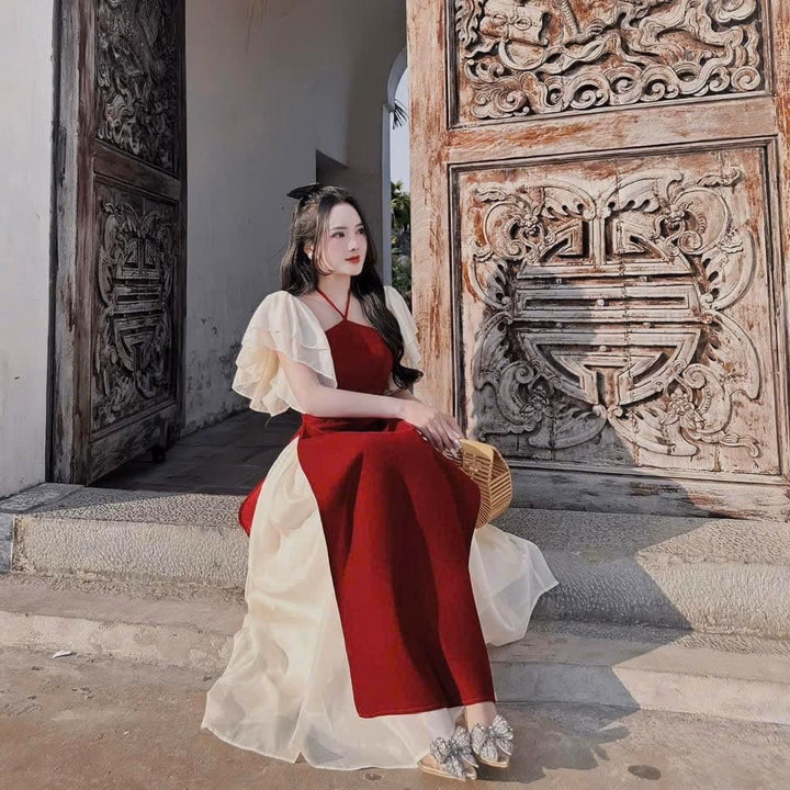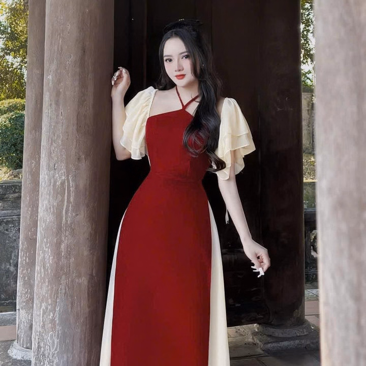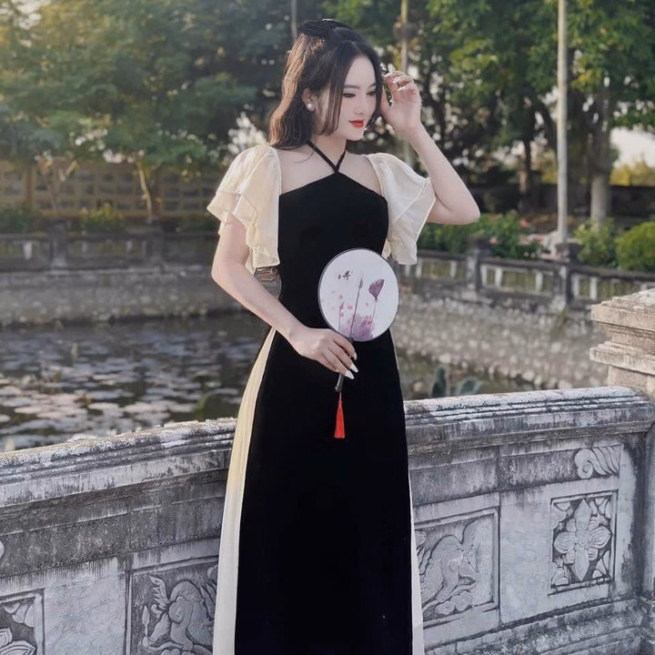 Set Áo Dài Nhung Tay Phối Voan Mix Chân Váy Tơ 2 Lớp Q45- Sam Store