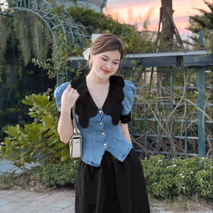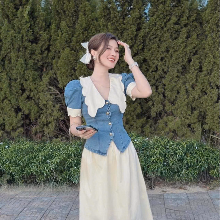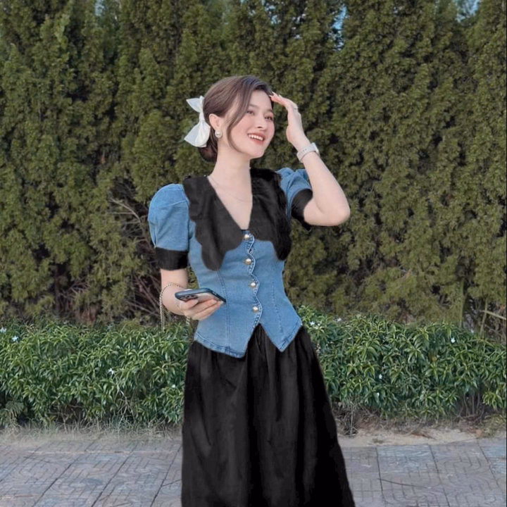 Set Áo Denim Cổ Lazer Mix Chân Váy Cotton Lạnh Sh1007 – Sam Store